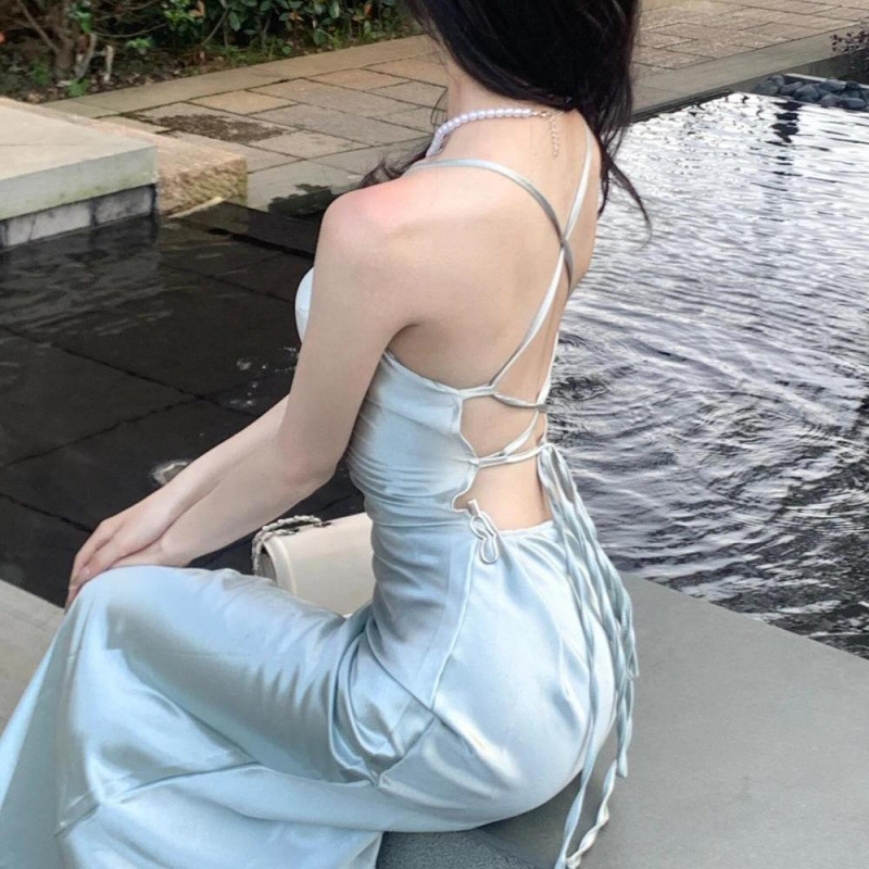 프랑스 스타일 로얄 자매 스타일 민트 그린 우아한 슬링 원피스 여성 여름 새로운 백리스 스트랩 허리 슬리밍 긴 원피스