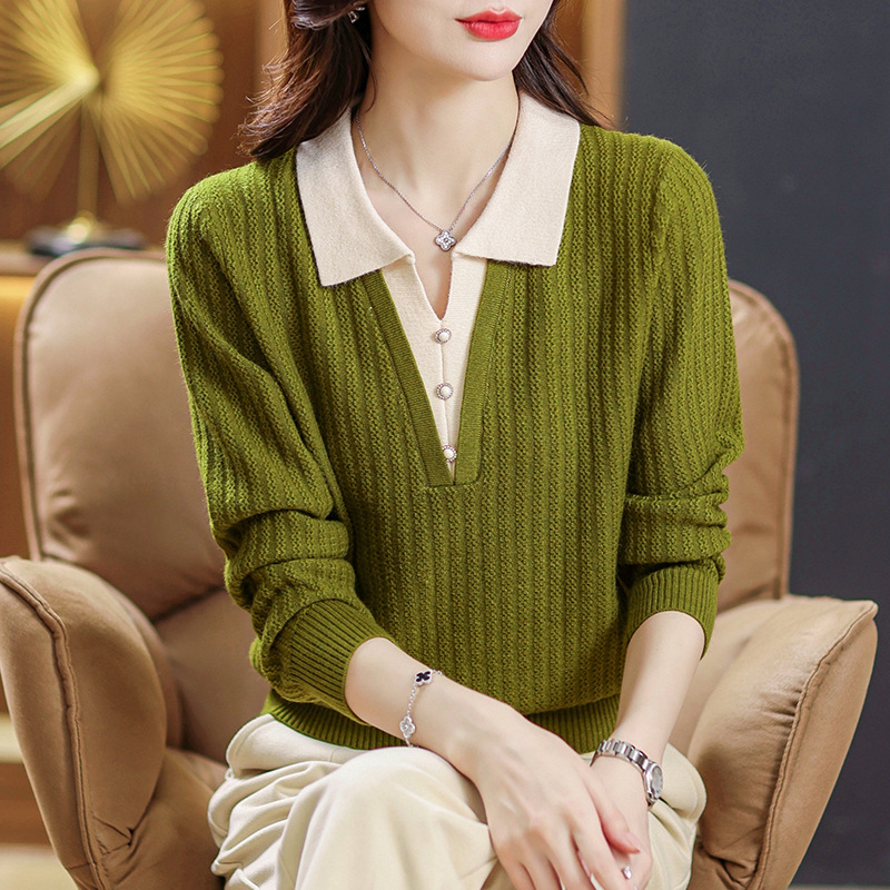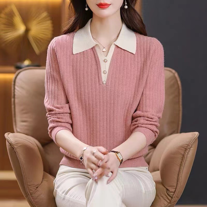 가짜 투피스 스웨터 탑 여성 중년 어머니 2024 가을과 겨울 새로운 POLO 칼라 스웨터 여성 니트 베이스 셔츠
