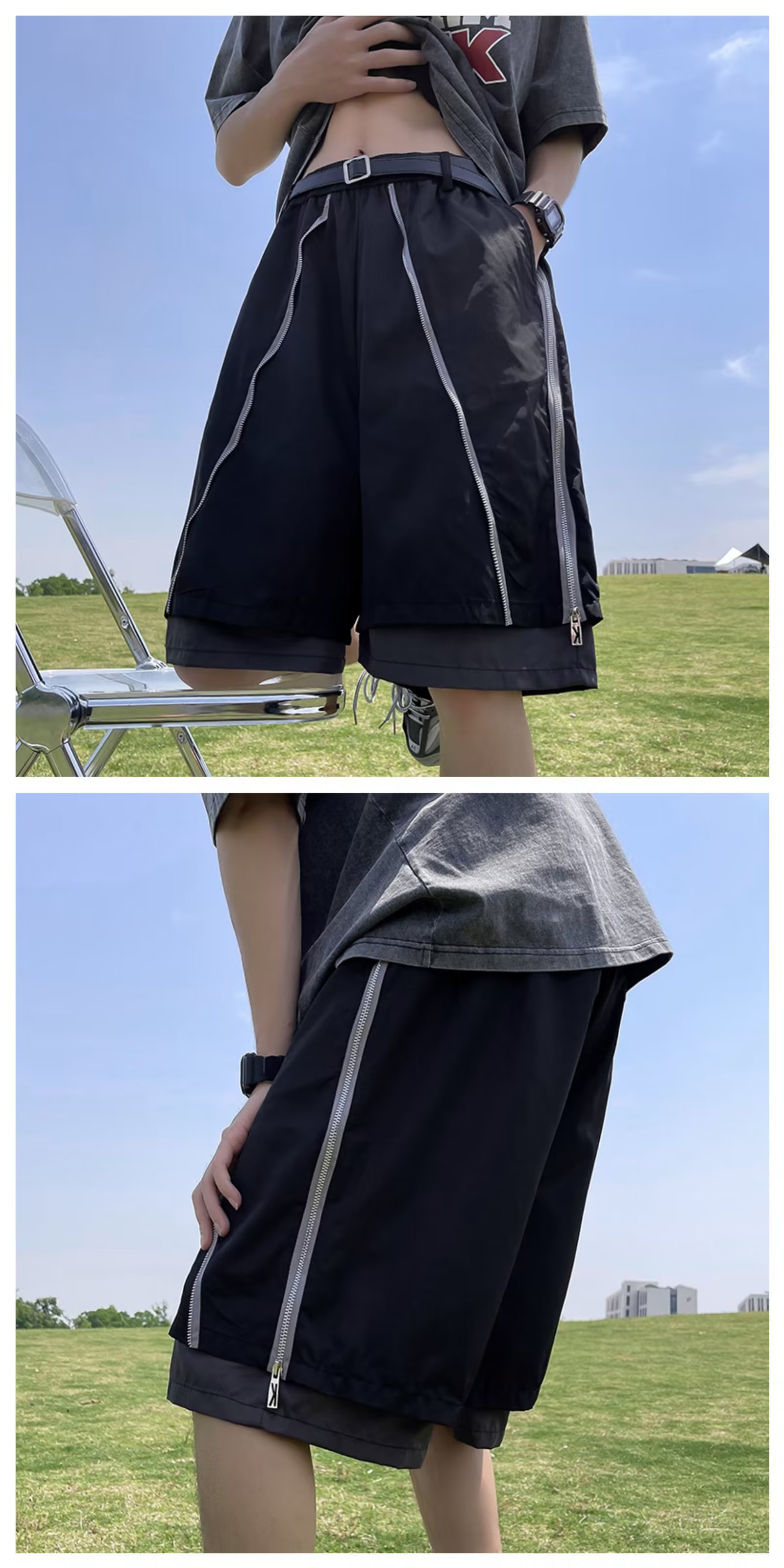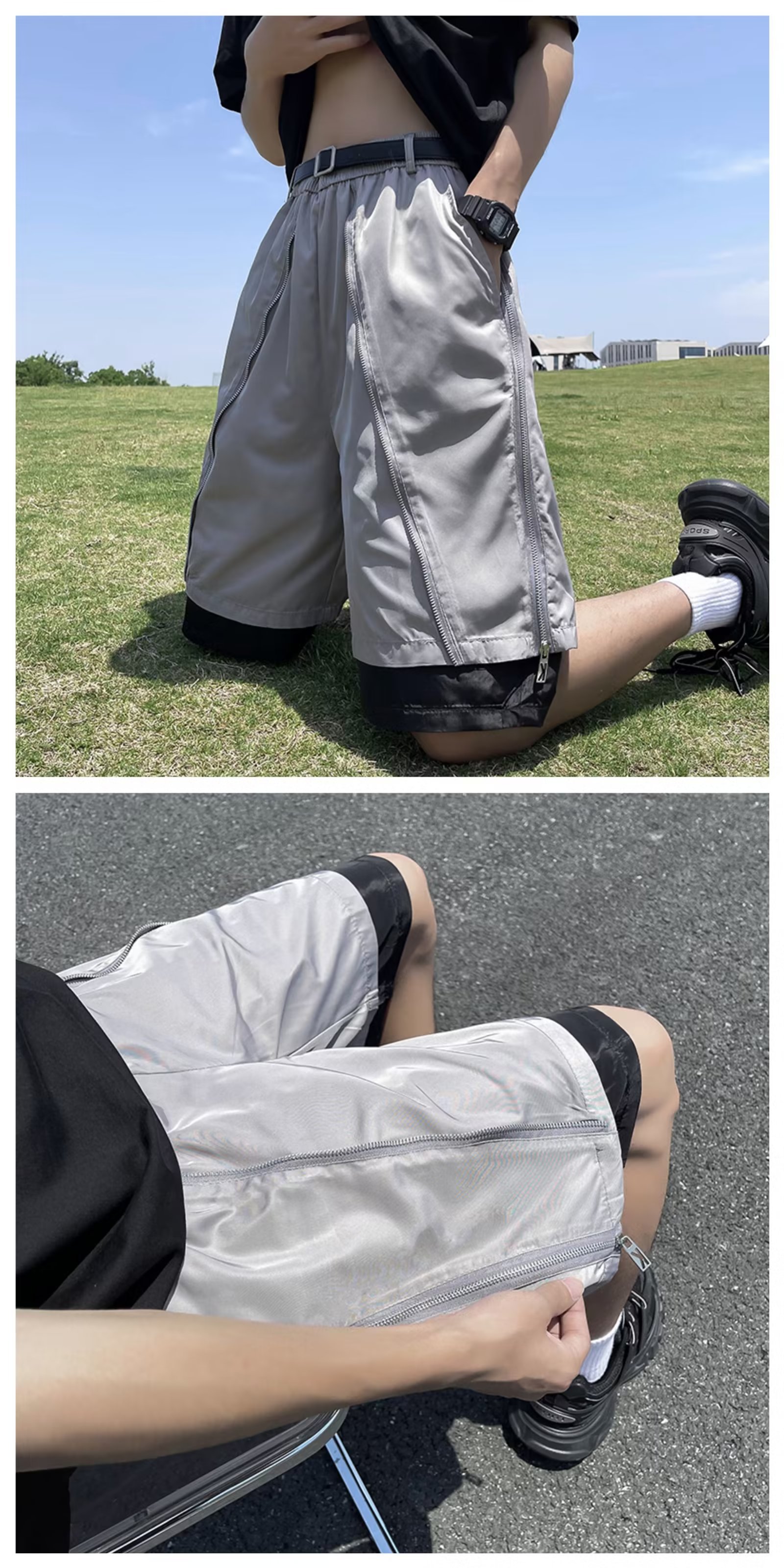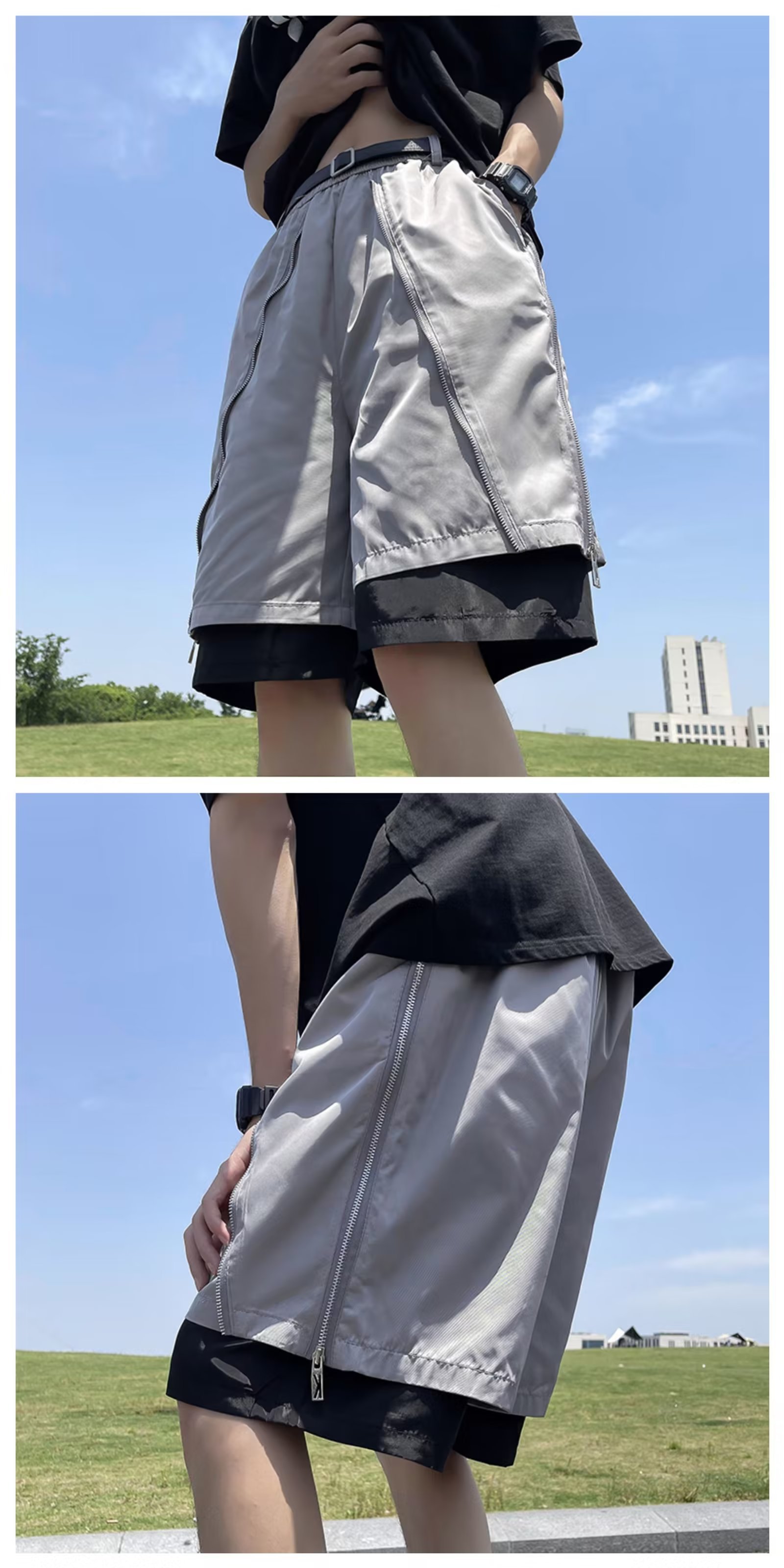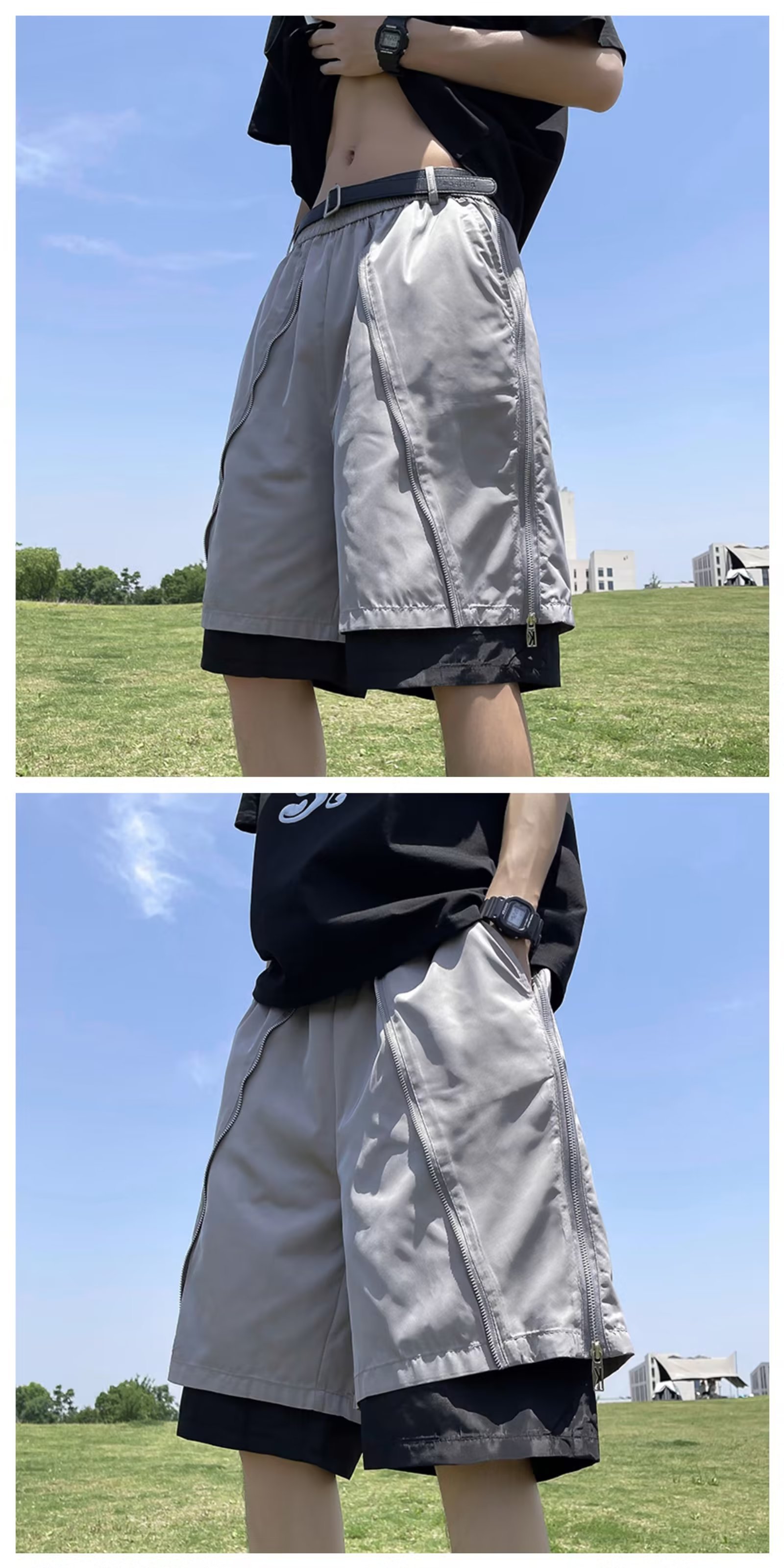 아메리칸 스타일 기능성 반바지 남성 여름 디자인 페이크 투피스 지퍼 자켓 루즈한 대형 캐주얼 5부 팬츠