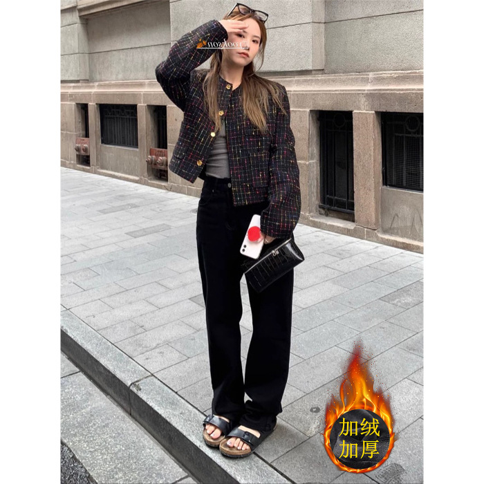 기모 두꺼운 밀크 화이트 스트레이트 청바지 여성의 가을과 겨울 2024 새로운 하이 웨이스트 올 매치 슬림 핏 플로어 머핑 바지스토어 가기