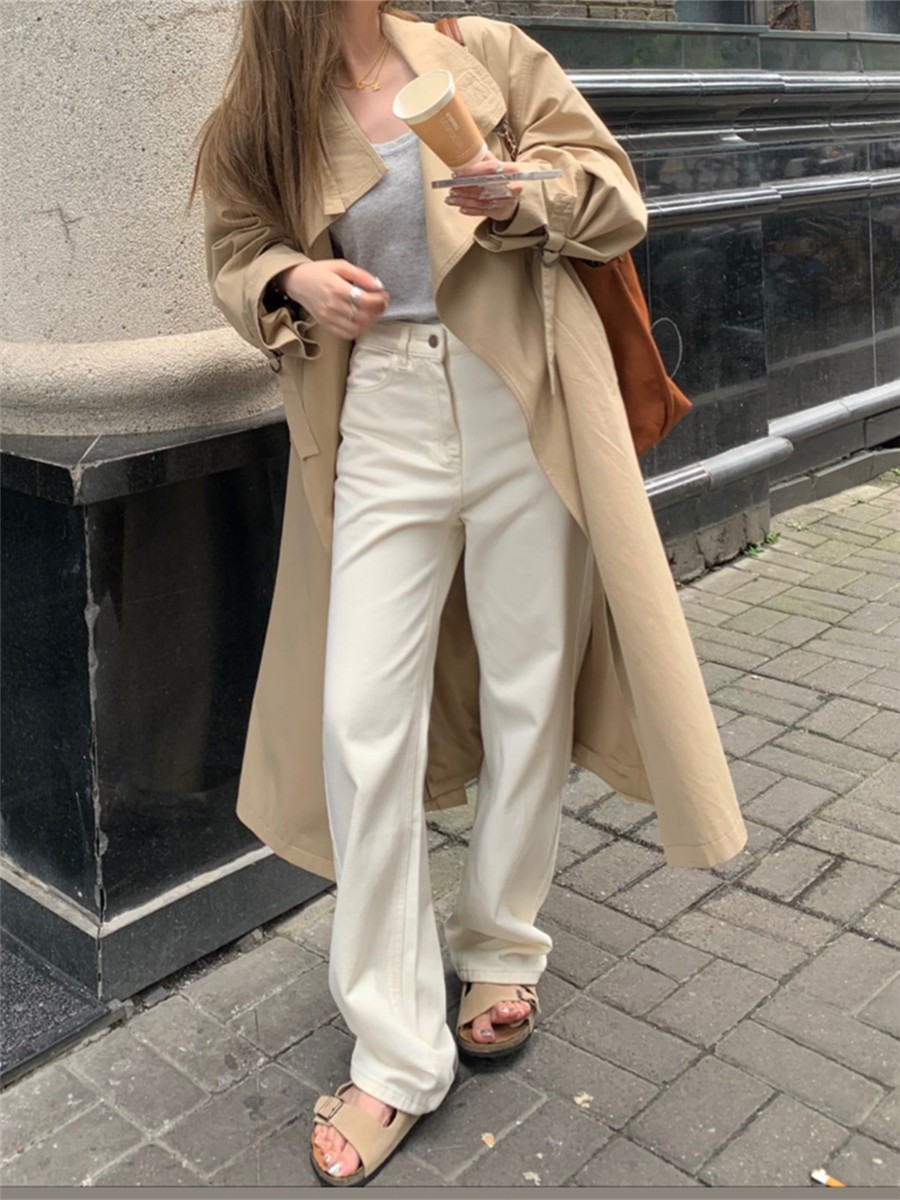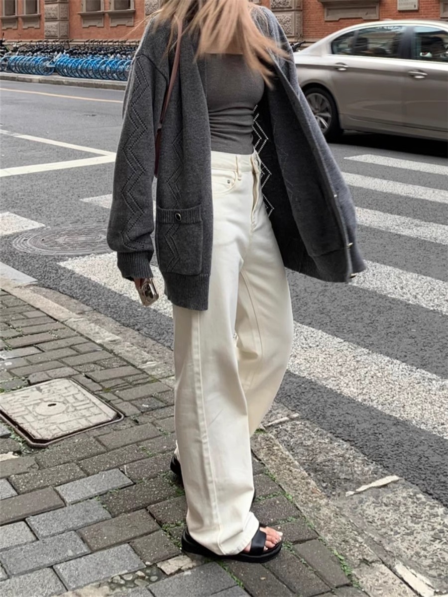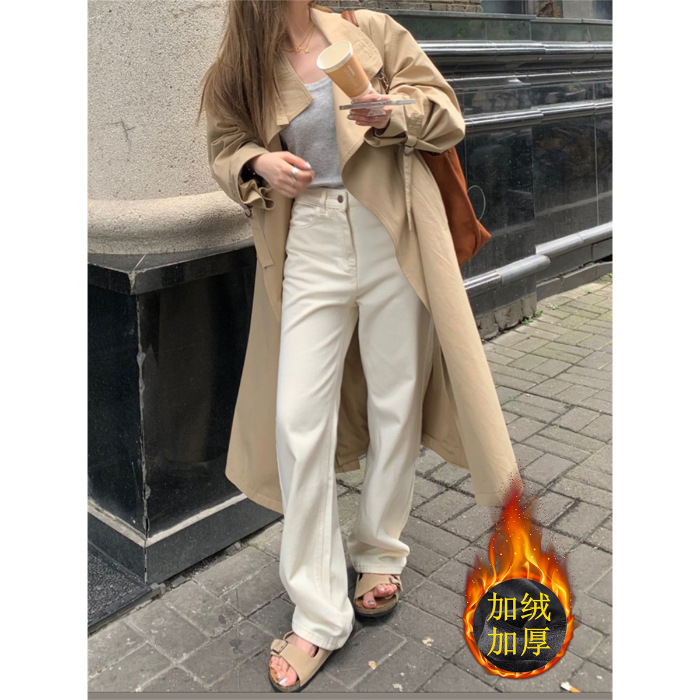 기모 두꺼운 밀크 화이트 스트레이트 청바지 여성의 가을과 겨울 2024 새로운 하이 웨이스트 올 매치 슬림 핏 플로어 머핑 바지