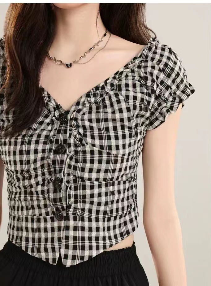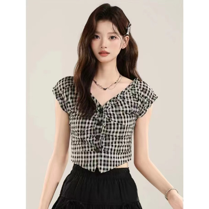 격자 무늬 민소매 셔츠 여성 여름 새로운 프랑스 스타일 독특한 격자 무늬 탑 디자인 감각 니쉬 슬리밍 민소매 작은 셔츠