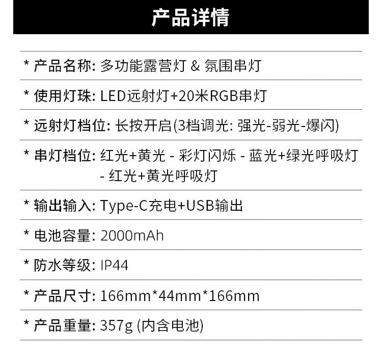 20 m 대기 LED 캠핑 라이트 USB 충전식 야외 텐트 스카이 커튼 라이트 스트링 테이프 측정 저장 휴대용 캠핑 라이트