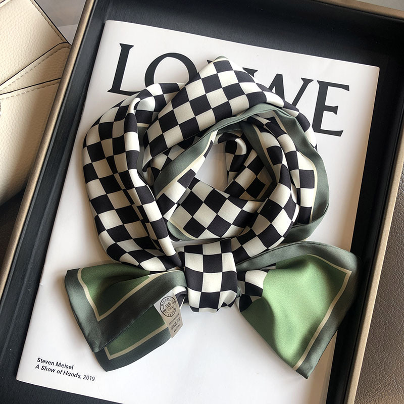 봄과 가을 한국식 경량 그린 체커 보드 더블 레이어 플랫 혼 실크 스카프 여성 프로페셔널 넥타이 가방