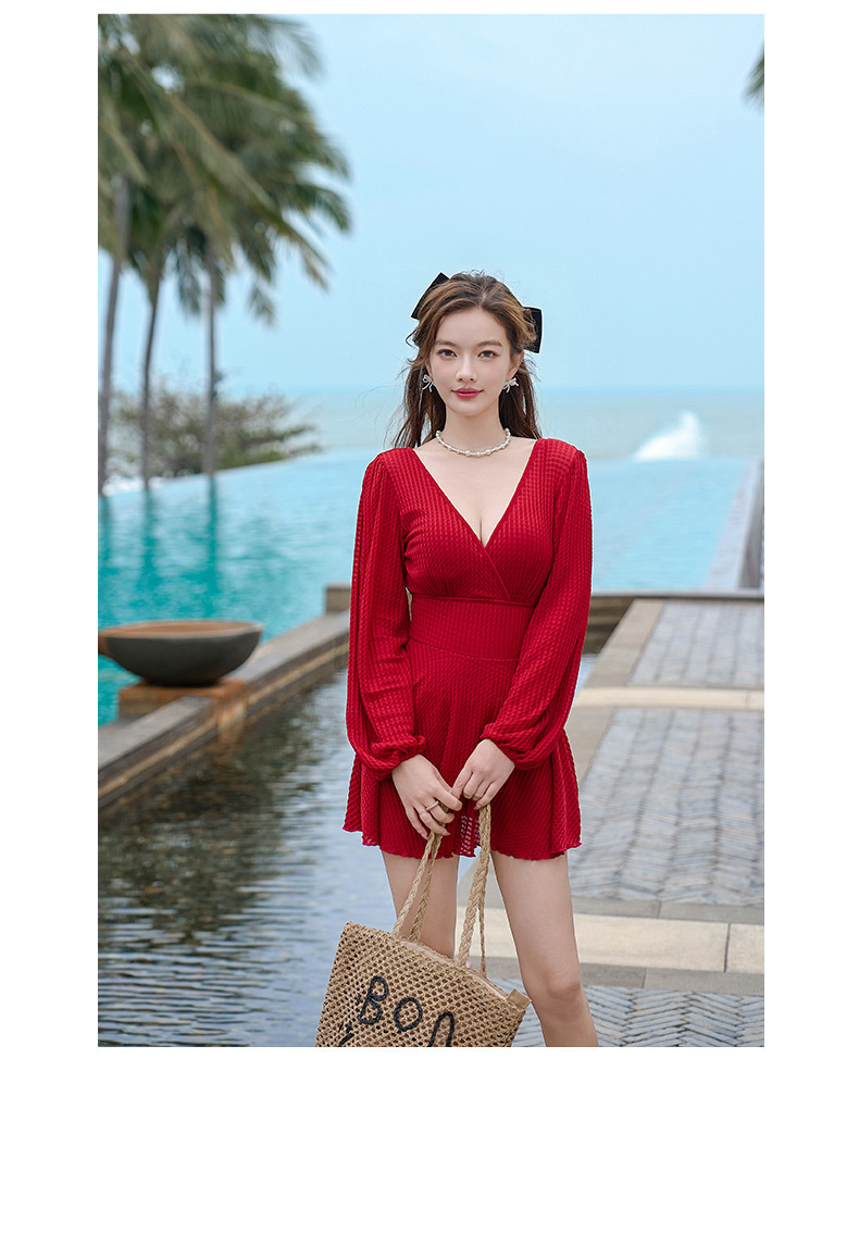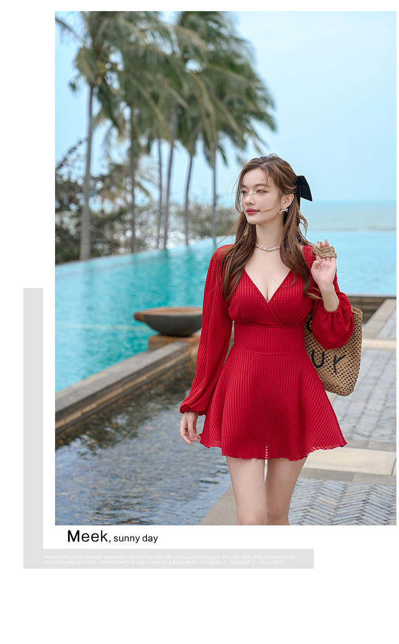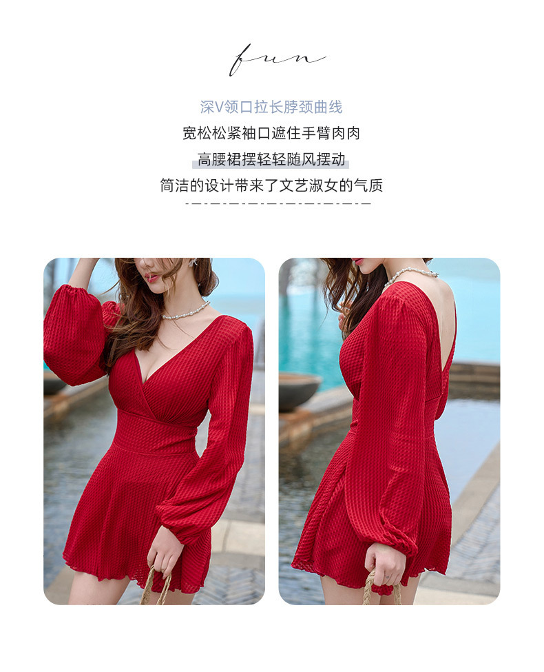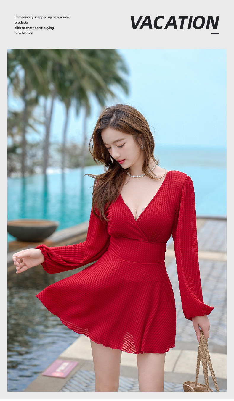 2025 Ginger 새로운 수영복 스커트 원피스 긴팔 작은 가슴 섹시 보수적 슬리밍 온천 여성 수영복