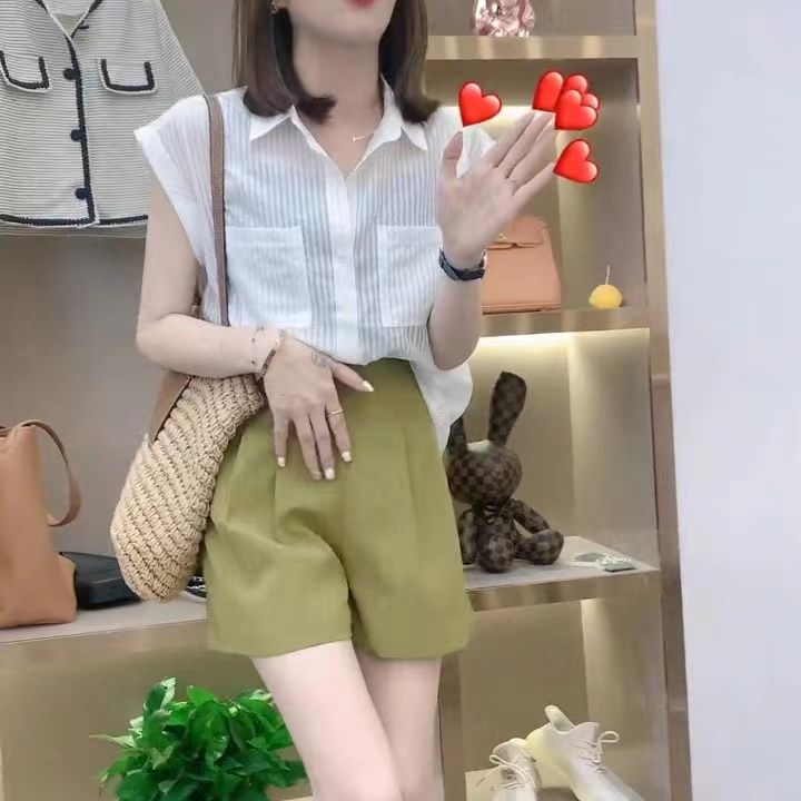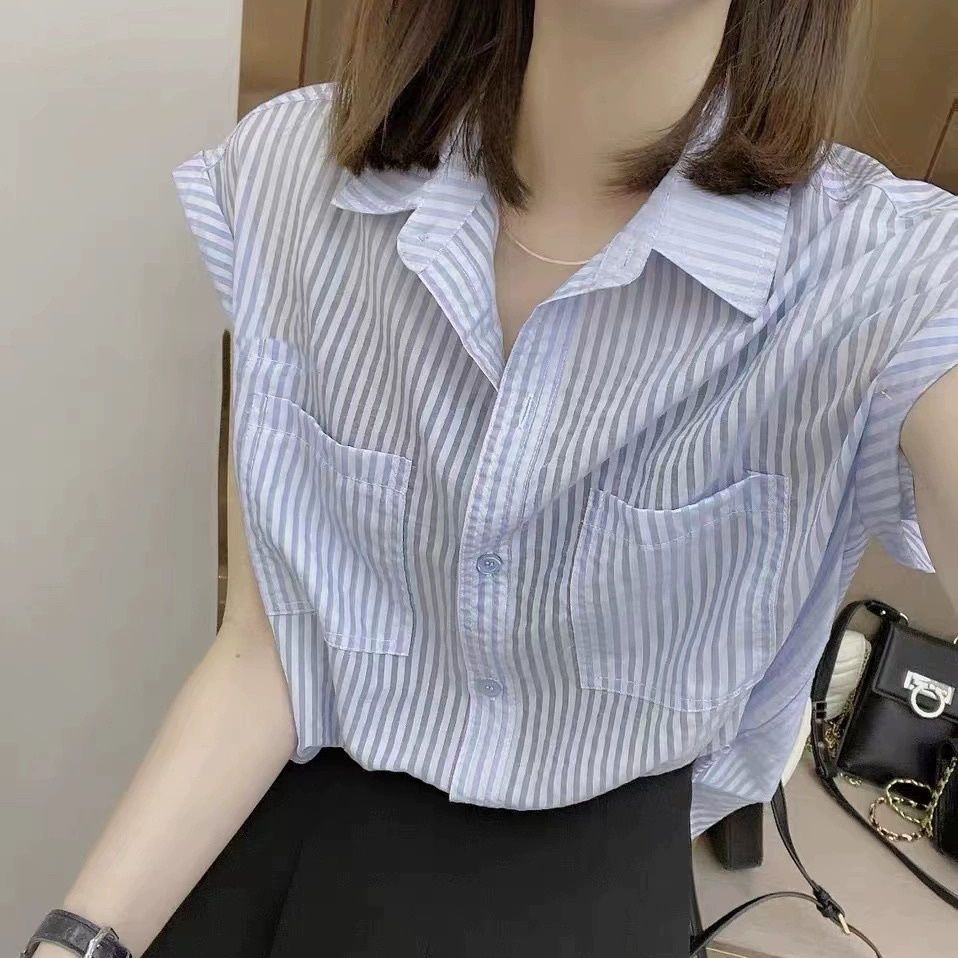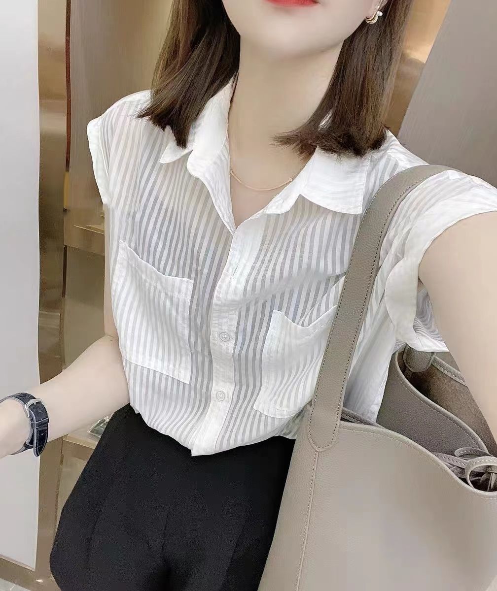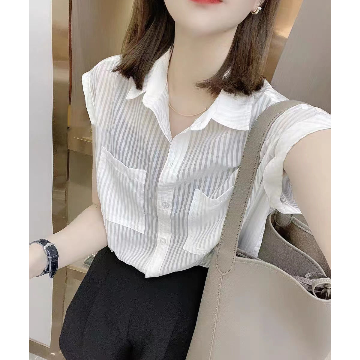 2025 여름 새로운 유럽 수직 줄무늬 쉬폰 셔츠 여성 디자인 센스 가볍고 투명한 우아한 폴로 칼라 포켓 탑스토어 가기