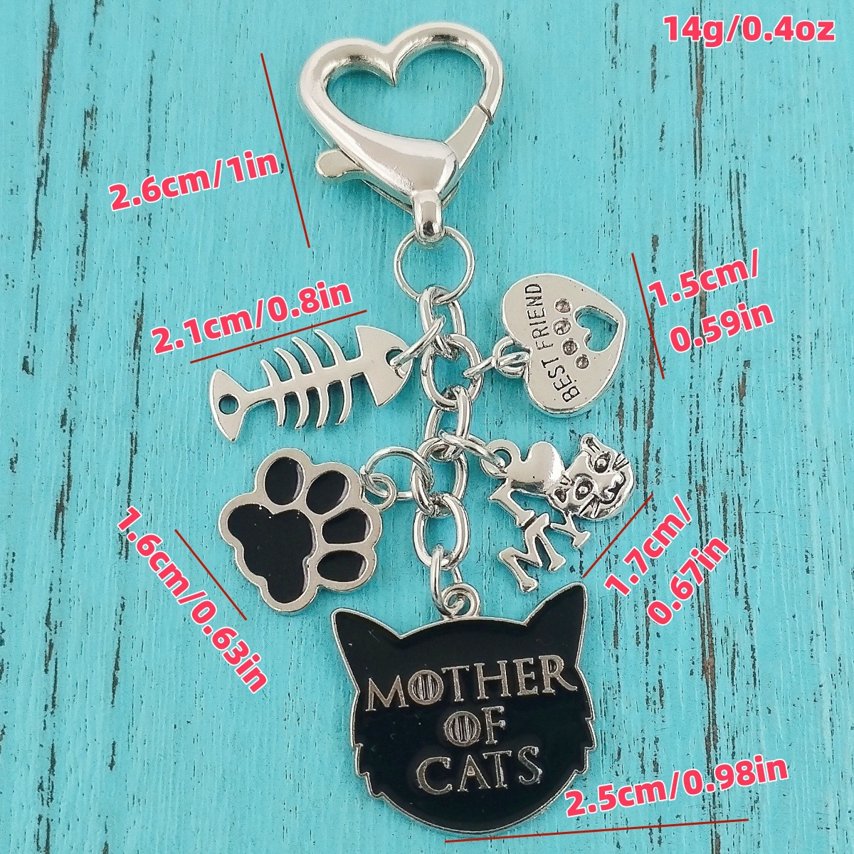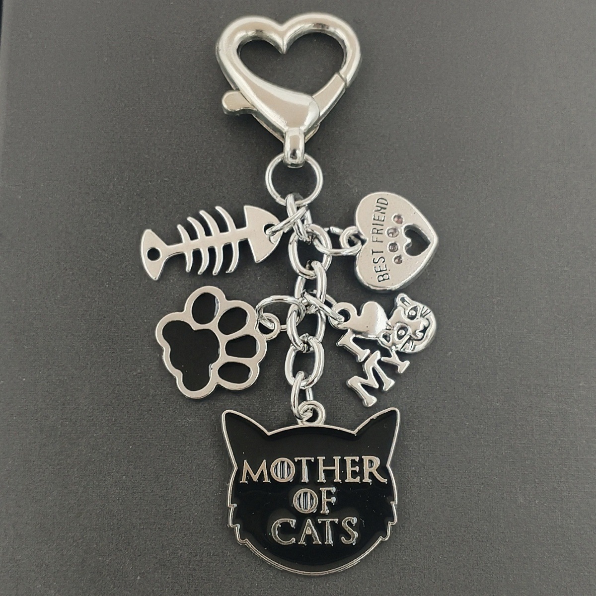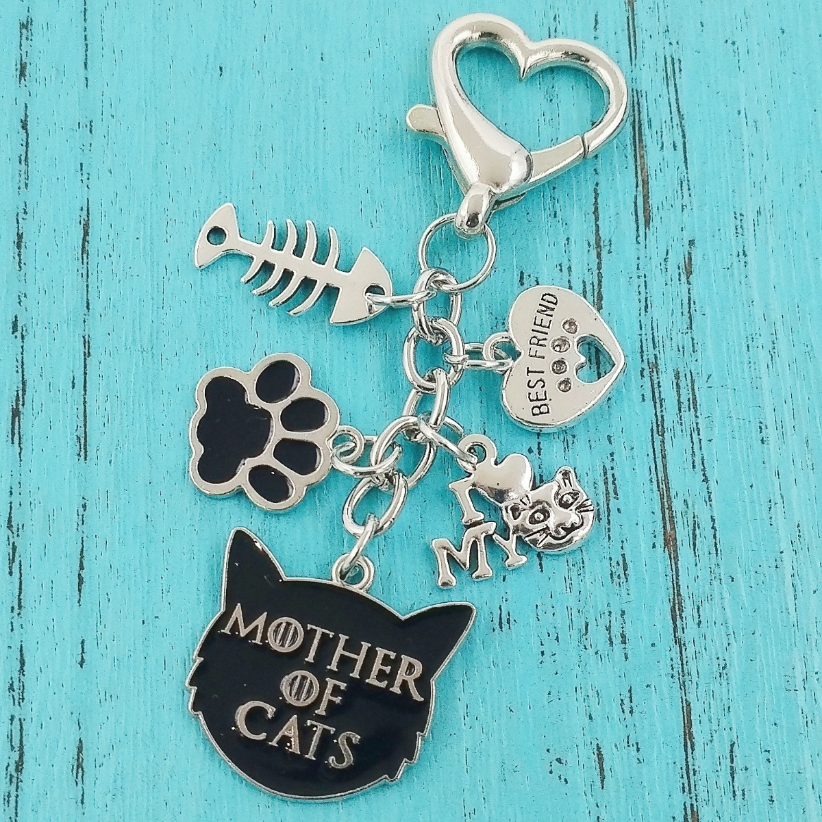 국경을 넘는 새로운 합금 오일 드립 고양이 엄마 열쇠 고리, 생선 뼈 하트 모양의 악마 고양이와 발자국 사랑 열쇠 고리