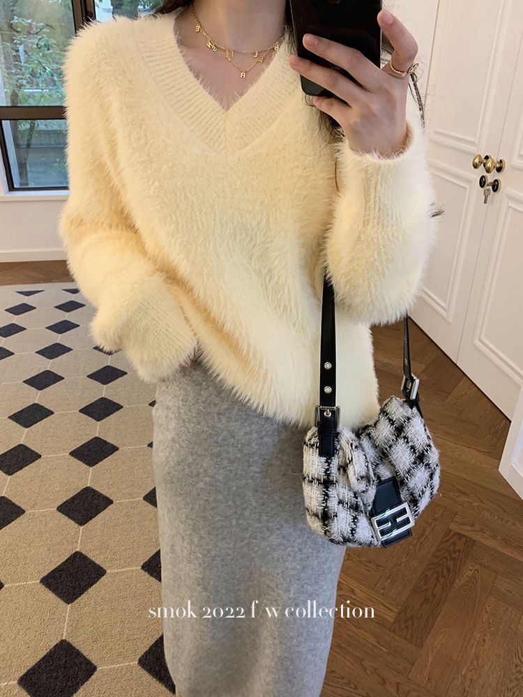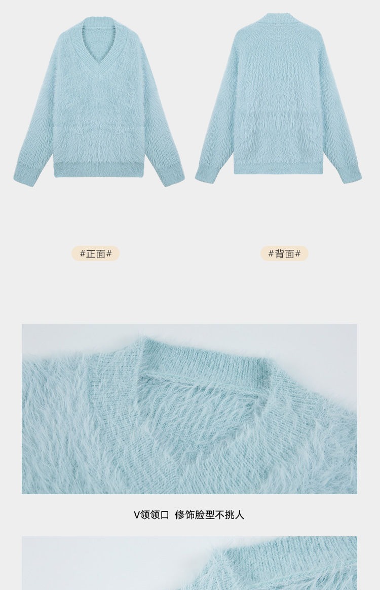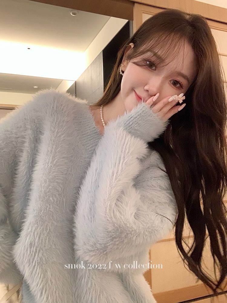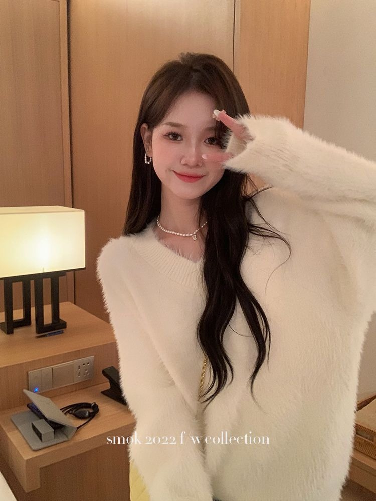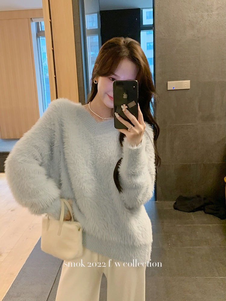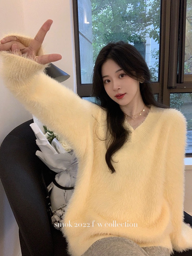2023冬季新款超厚实v领很仙水貂绒毛衣女套头宽松慵懒风上衣潮