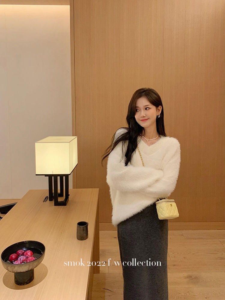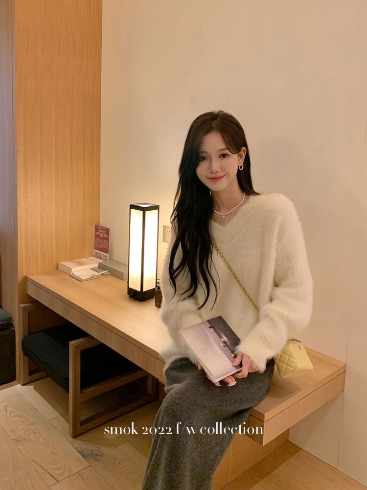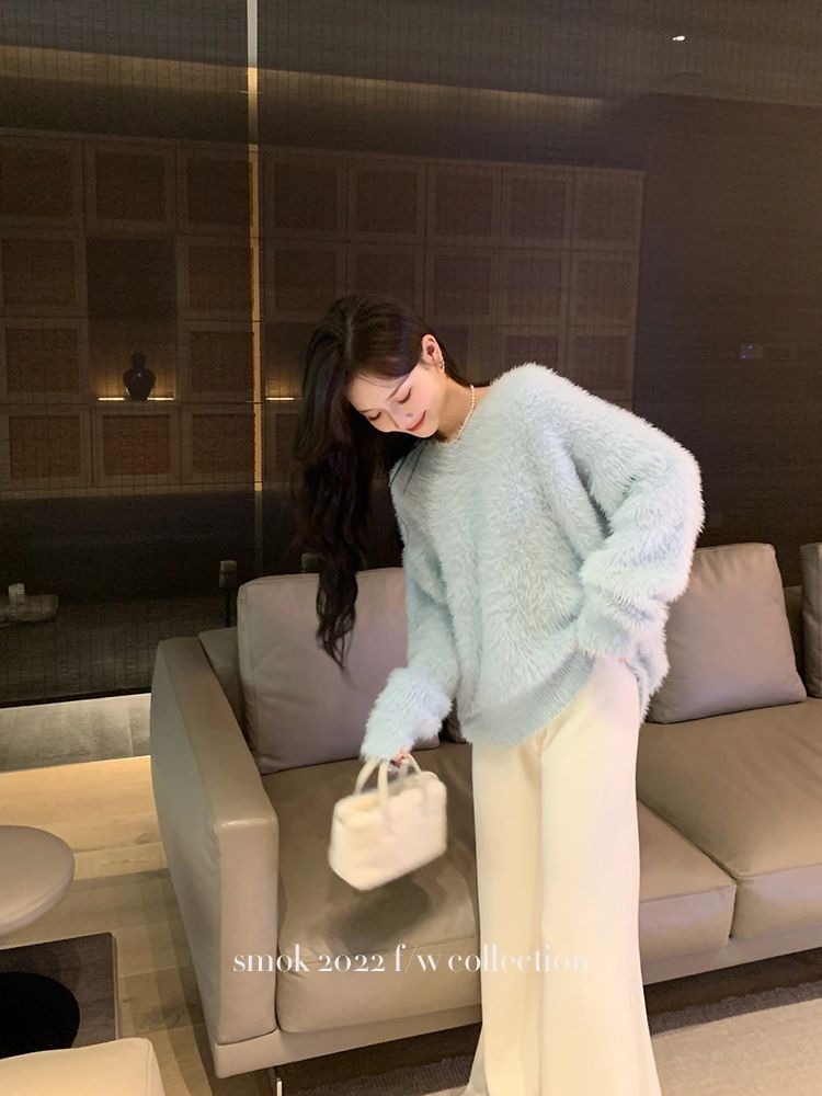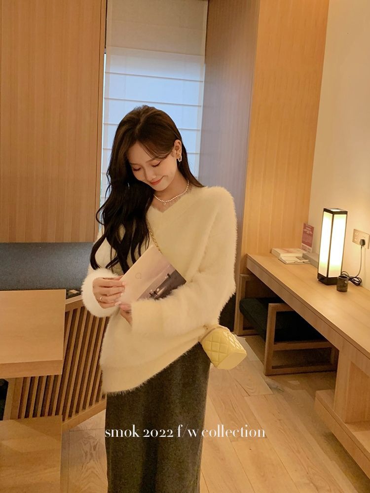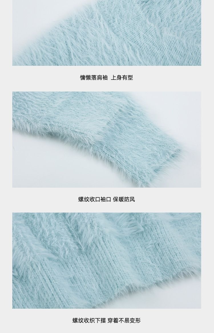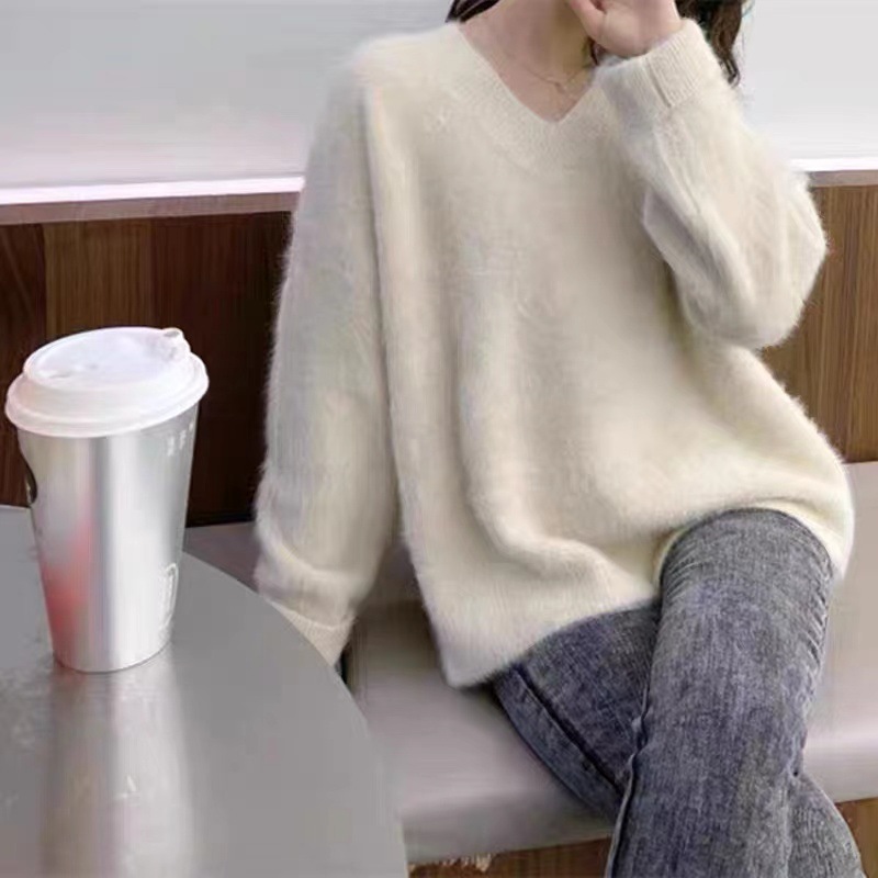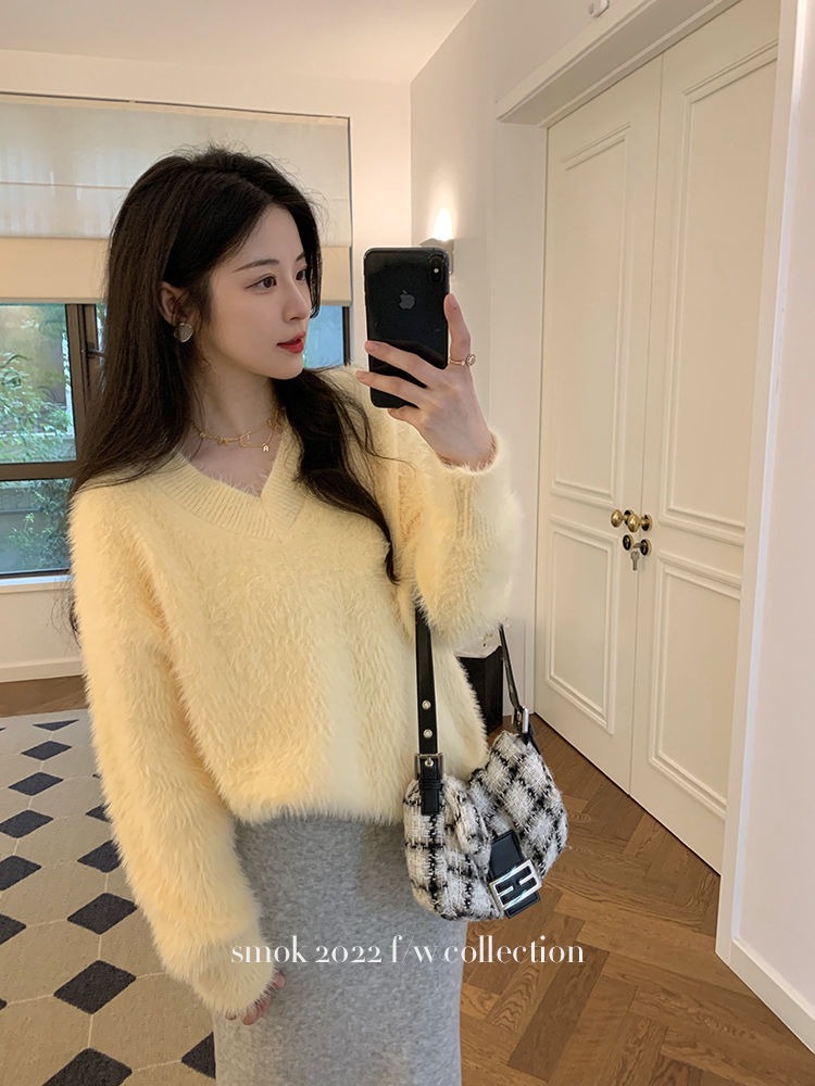 2023冬季新款超厚实v领很仙水貂绒毛衣女套头宽松慵懒风上衣潮