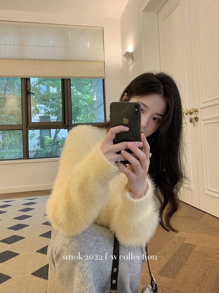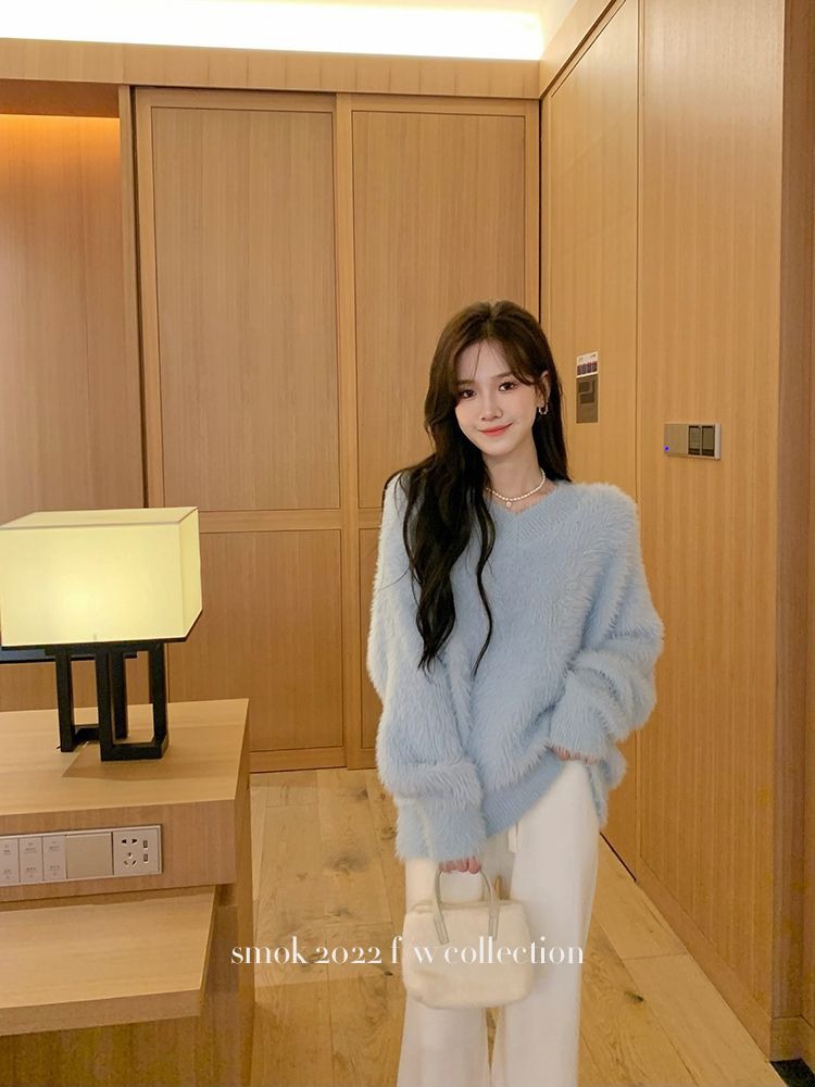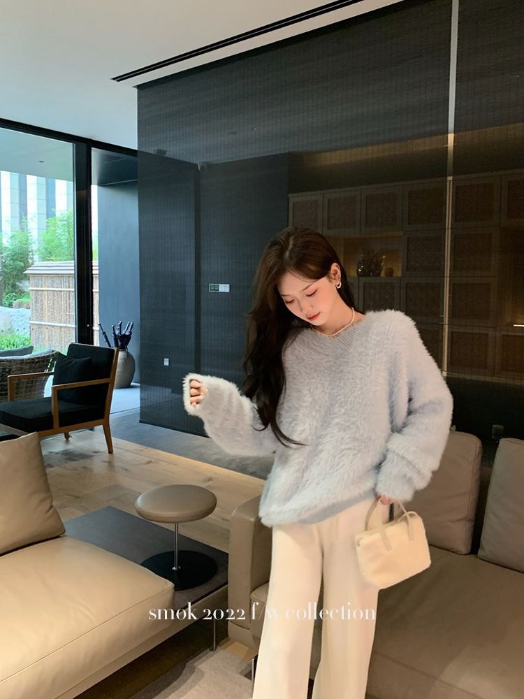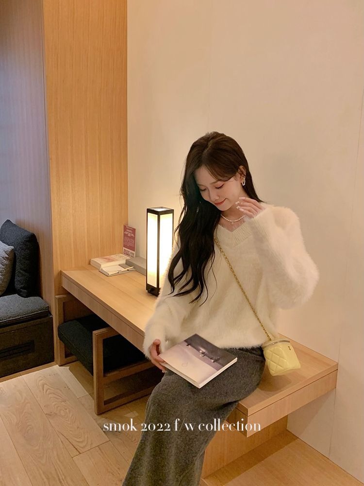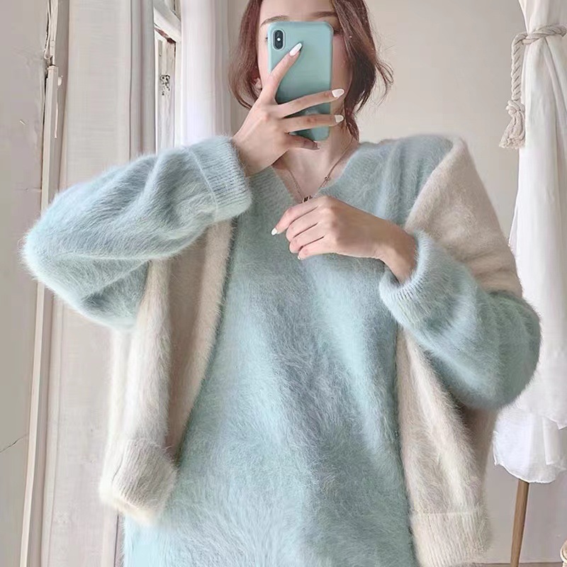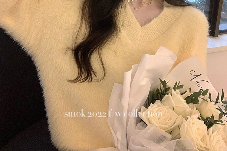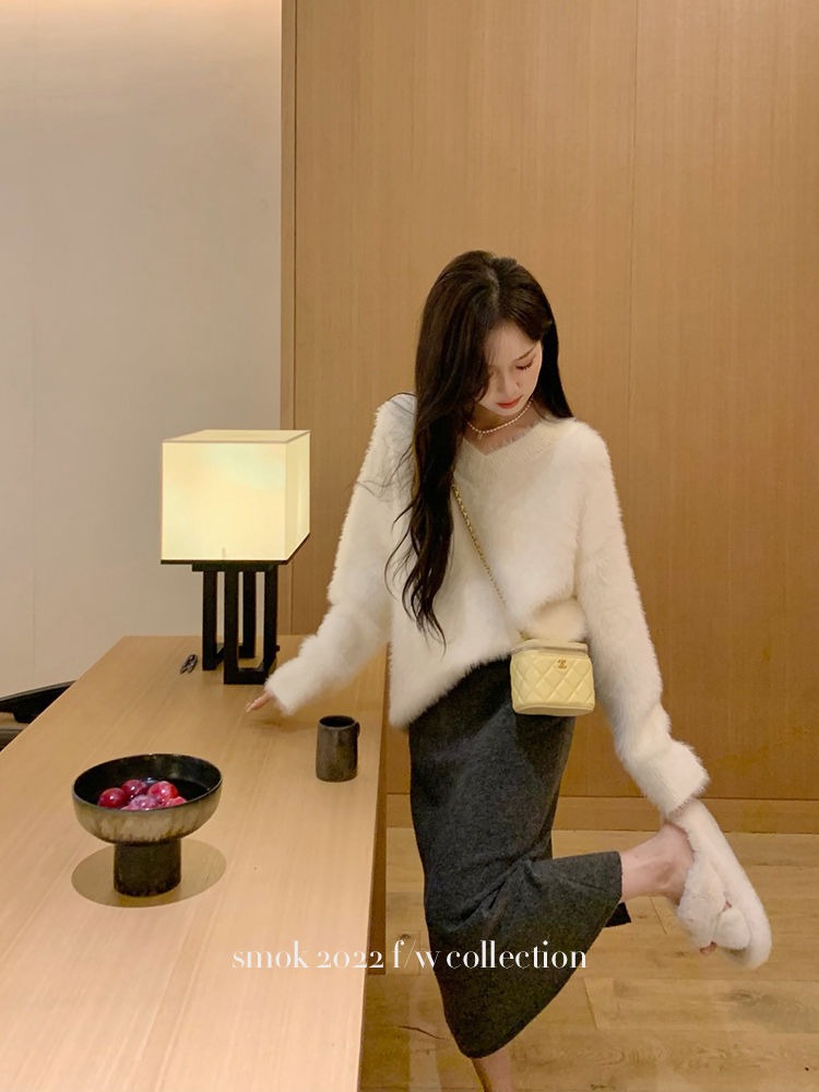 2023冬季新款超厚实v领很仙水貂绒毛衣女套头宽松慵懒风上衣潮