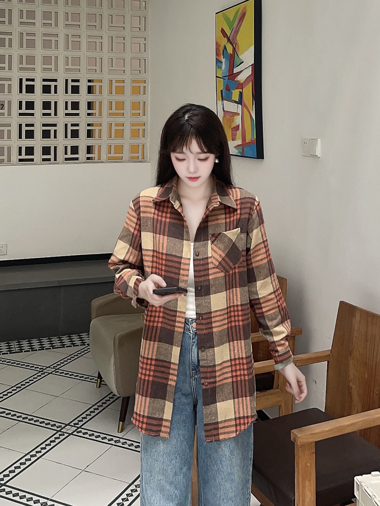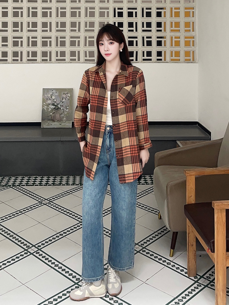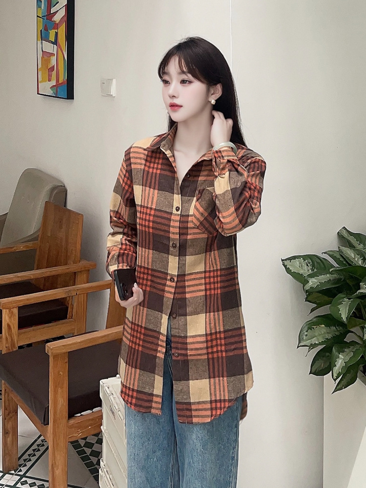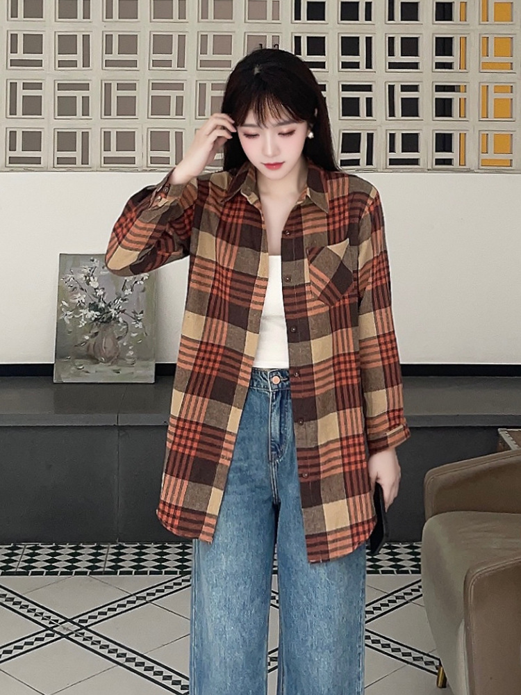 격자 무늬 셔츠 코트 여성 중간 길이의 봄 및 가을 외부 면화 및 리넨 셔츠 긴팔 선 스크린 셔츠 서양식 최고 디자인 감각스토어 가기