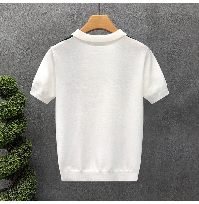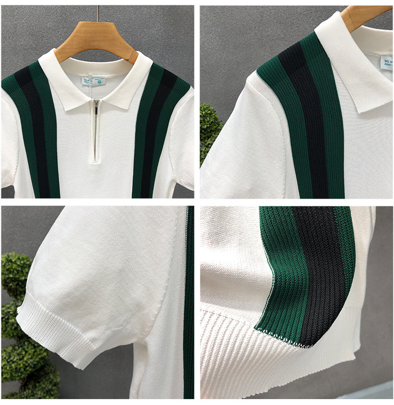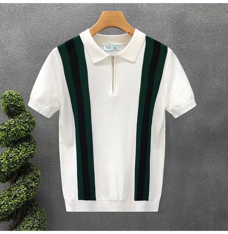 여름 한국 스타일 청소년 캐주얼 아이스 실크 슬림 핏 남성 수직 스트라이프 럭 니트 반팔 티셔츠 비즈니스 폴로 셔츠