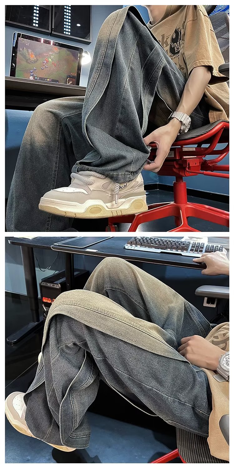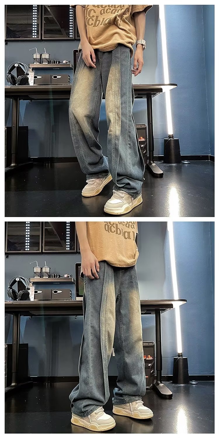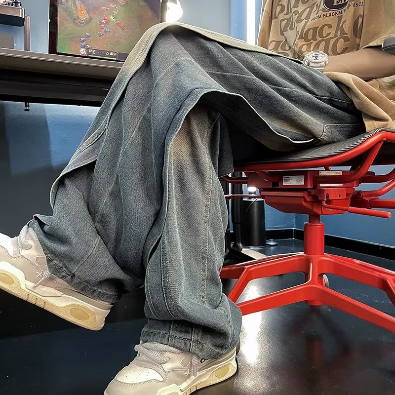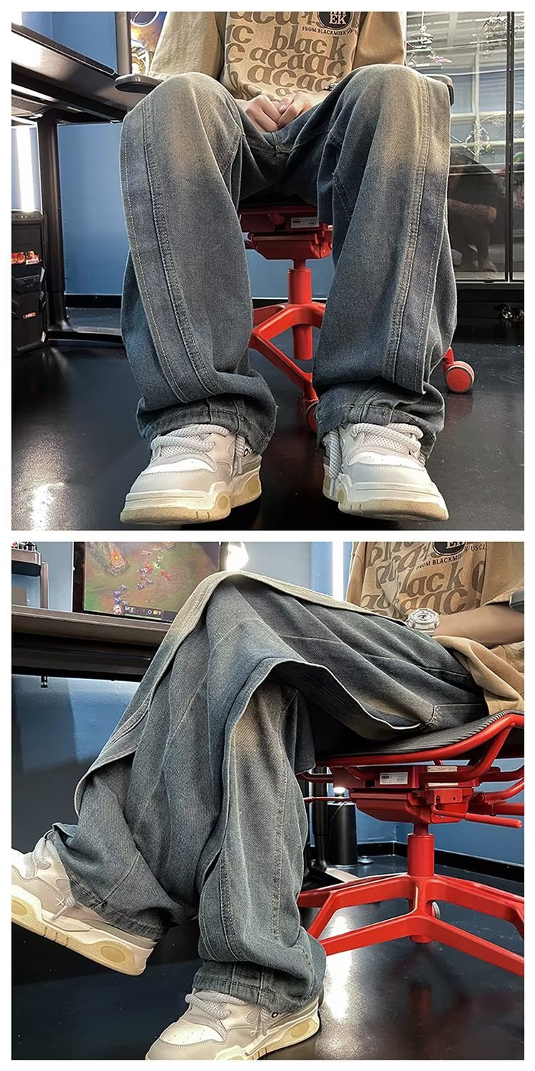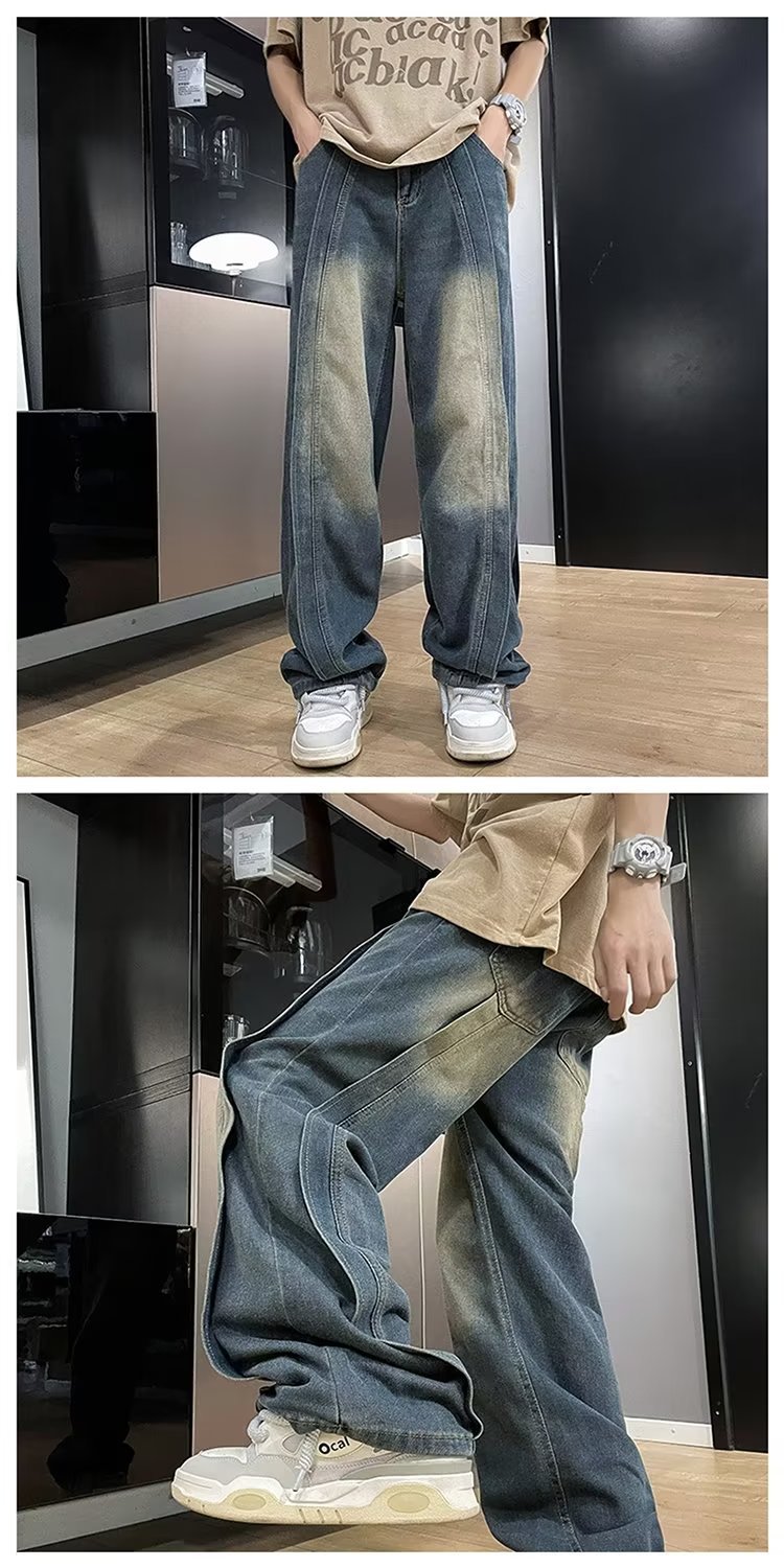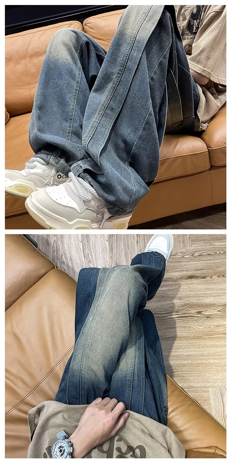 국경 간 레트로 청바지 남성 디자인 센스 틈새 미국식 바이브 바지 느슨한 와이드 레그 캐주얼 스트레이트 바지