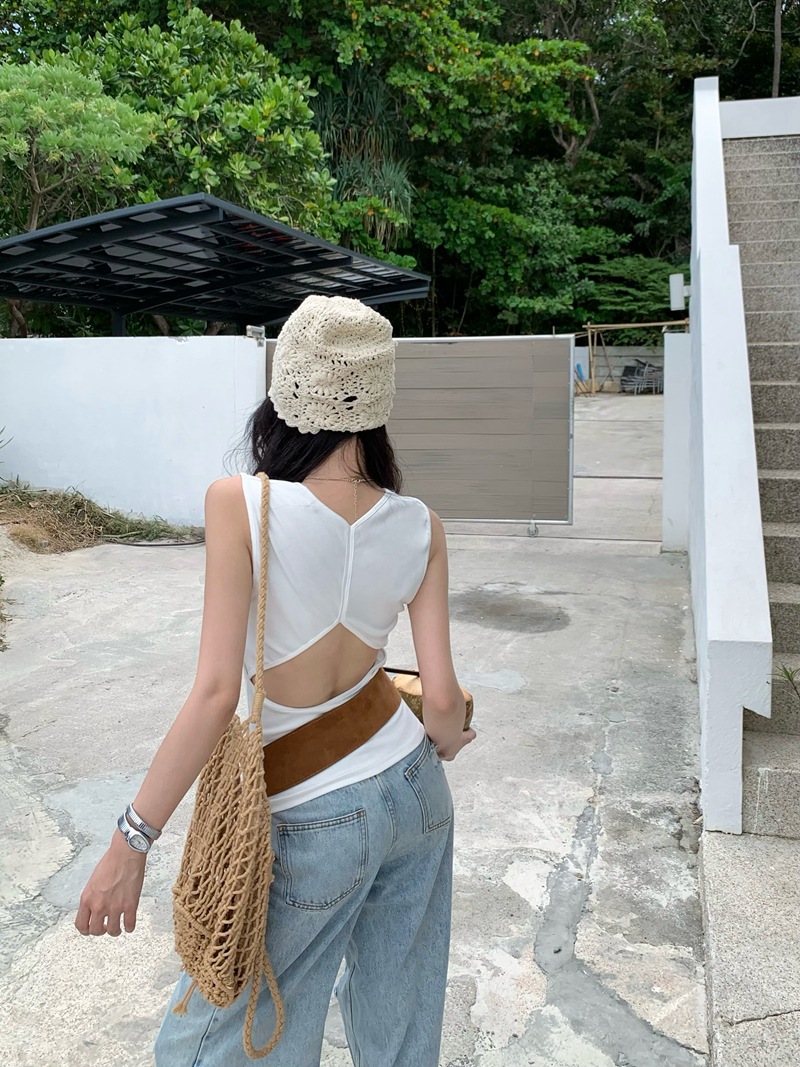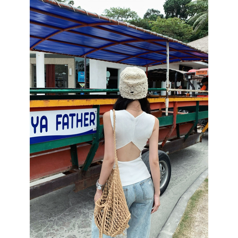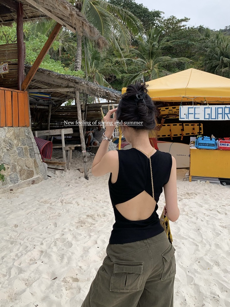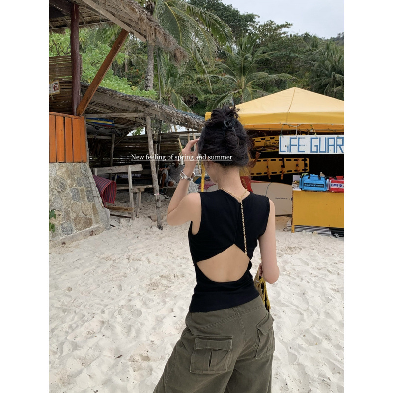 리얼 샷 패셔너블 핫 걸 스타일 디자인 센스 솔리드 컬러 할로우 백리스 민소매 조끼 여성 슬리밍 탑스토어 가기