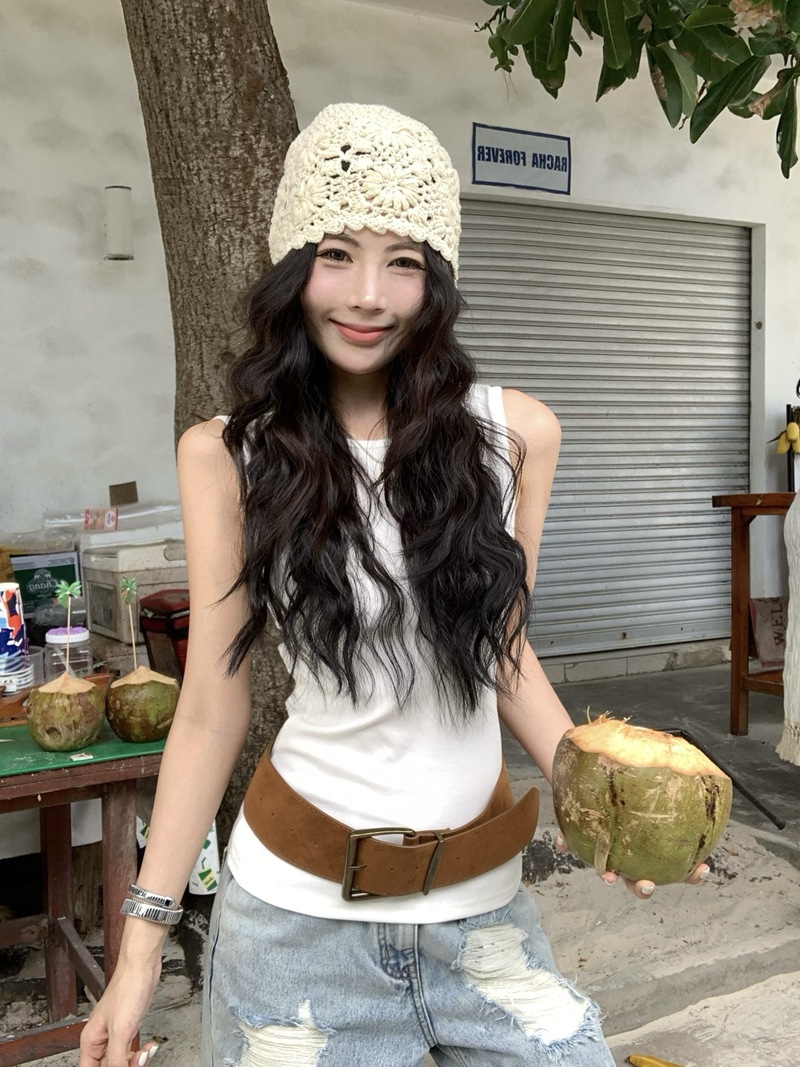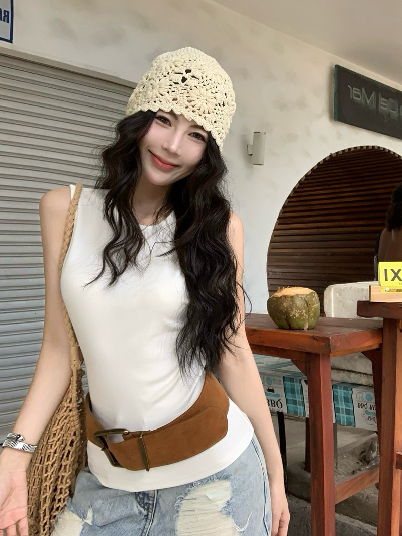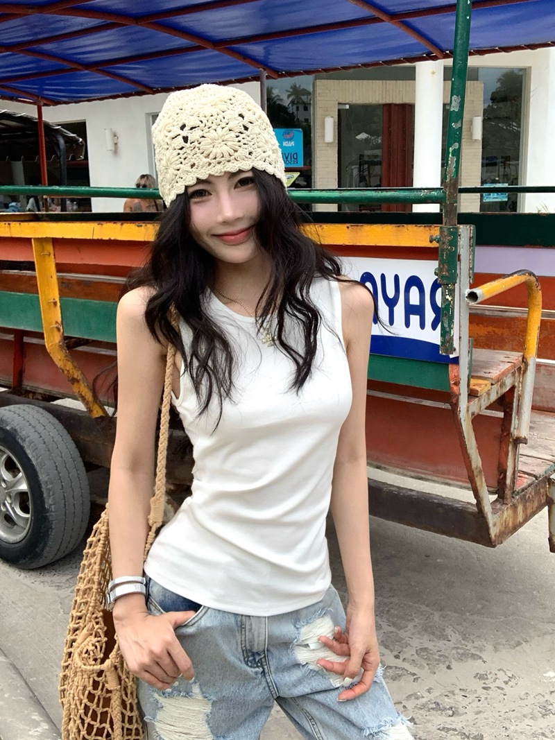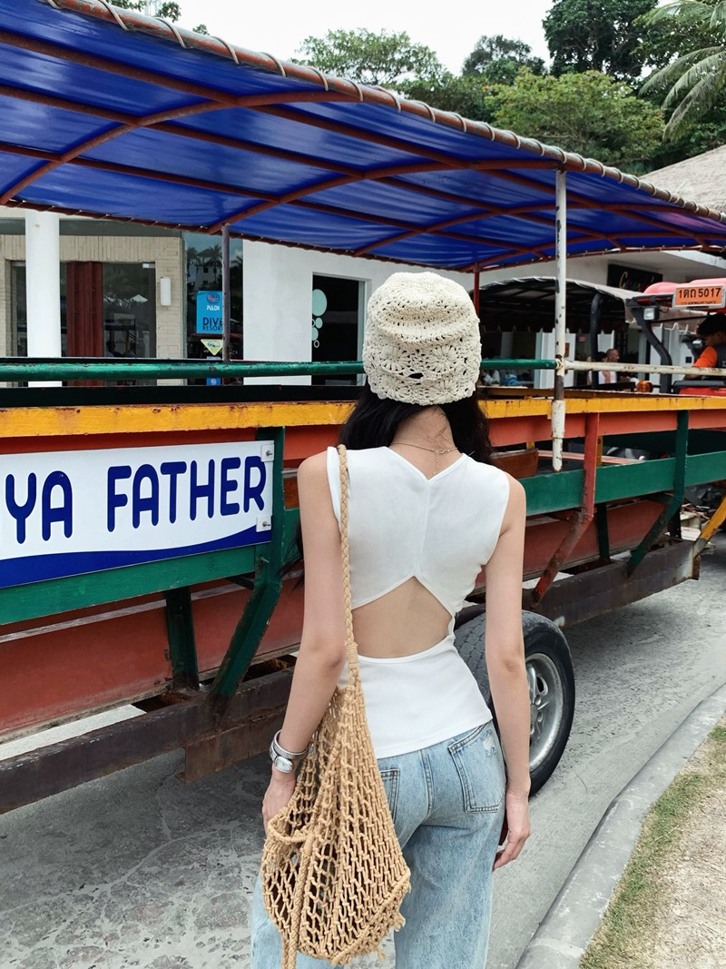 리얼 샷 패셔너블 핫 걸 스타일 디자인 센스 솔리드 컬러 할로우 백리스 민소매 조끼 여성 슬리밍 탑스토어 가기