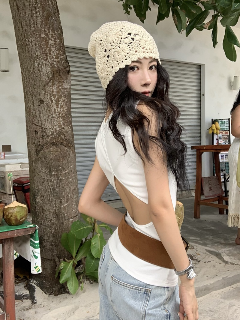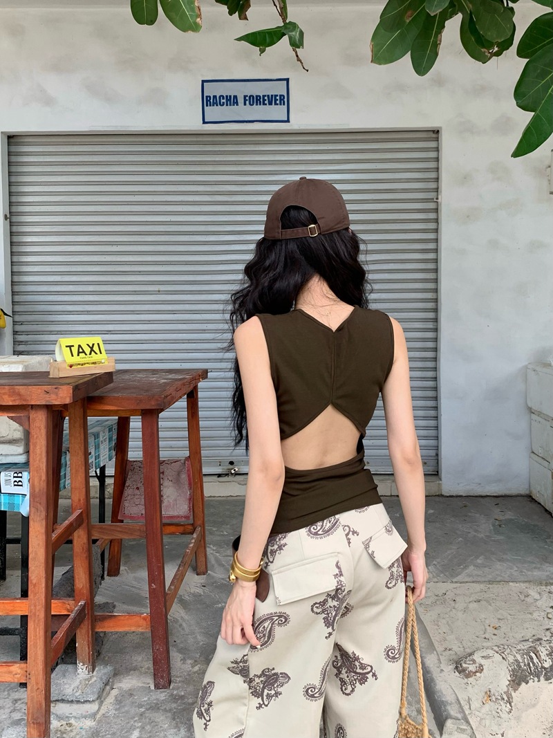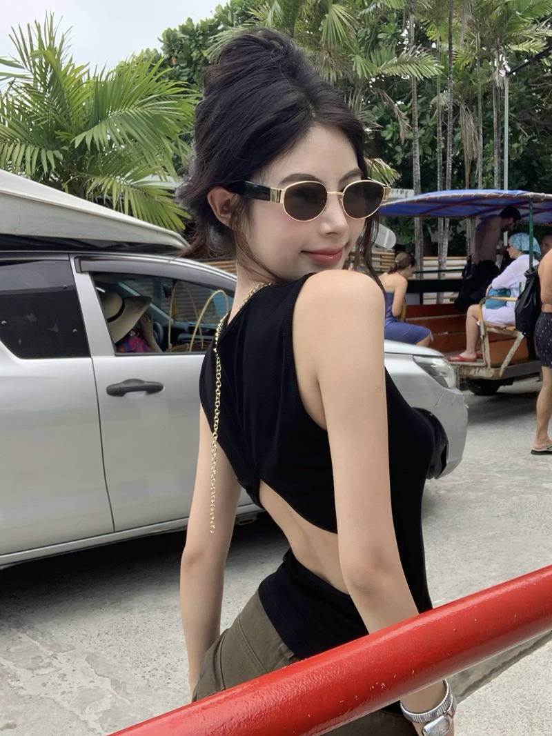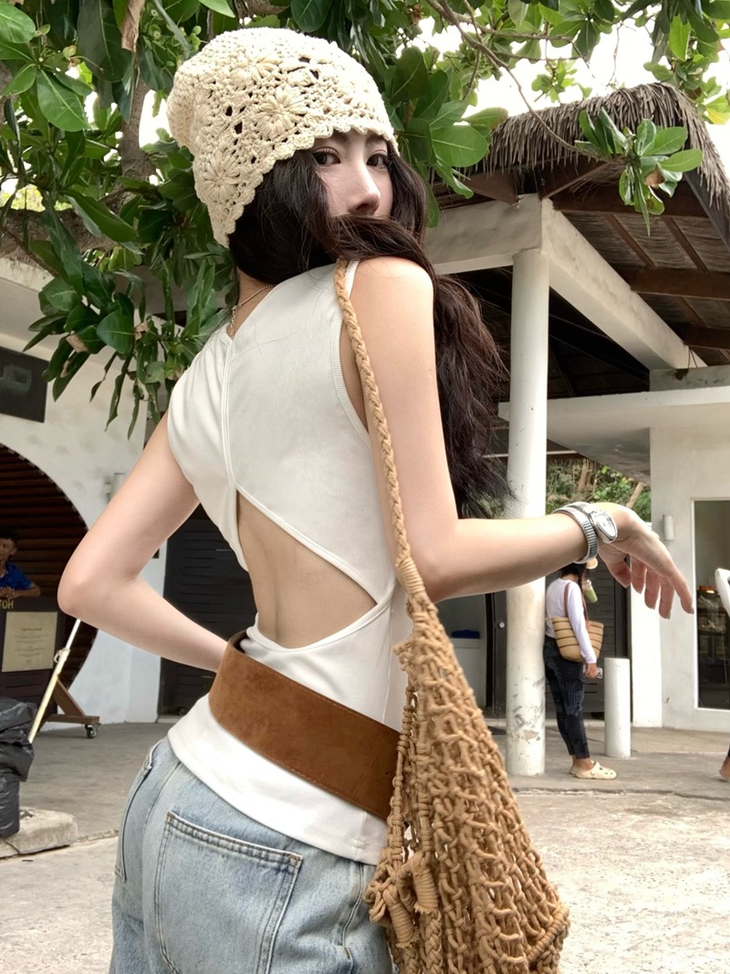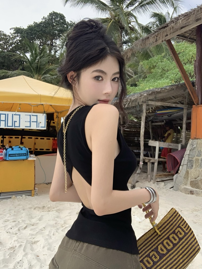 리얼 샷 패셔너블 핫 걸 스타일 디자인 센스 솔리드 컬러 할로우 백리스 민소매 조끼 여성 슬리밍 탑