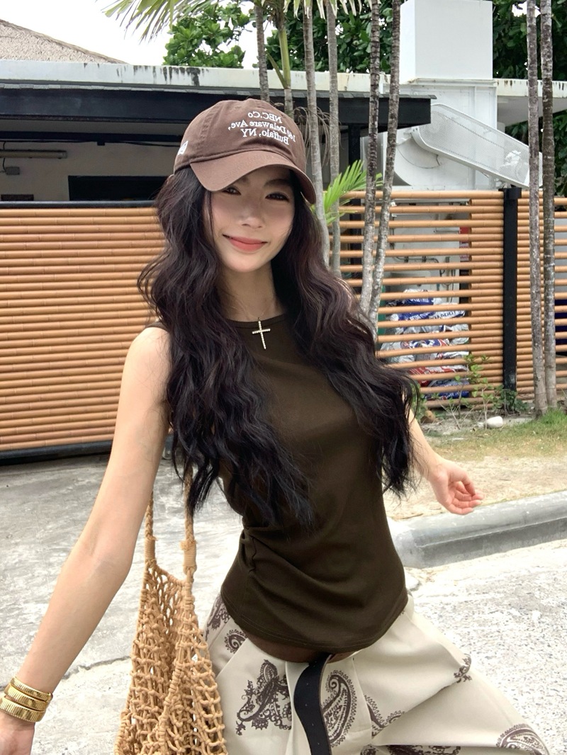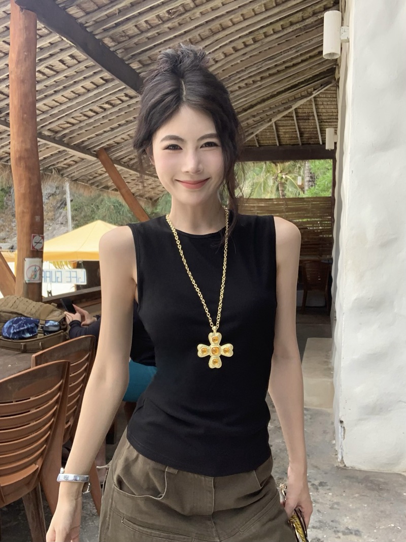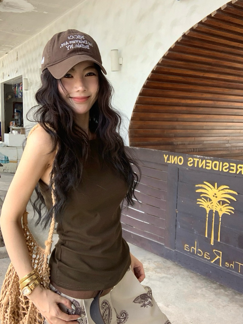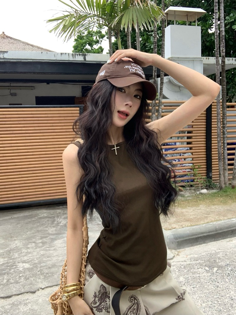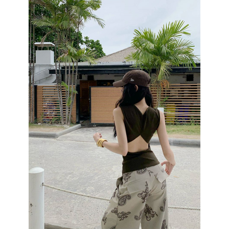 리얼 샷 패셔너블 핫 걸 스타일 디자인 센스 솔리드 컬러 할로우 백리스 민소매 조끼 여성 슬리밍 탑