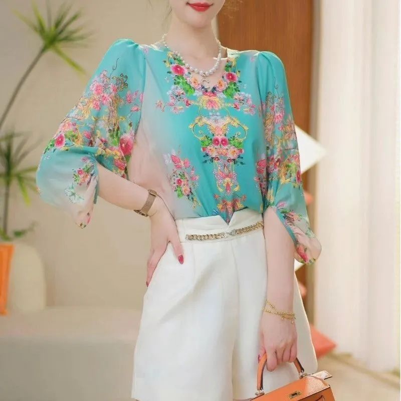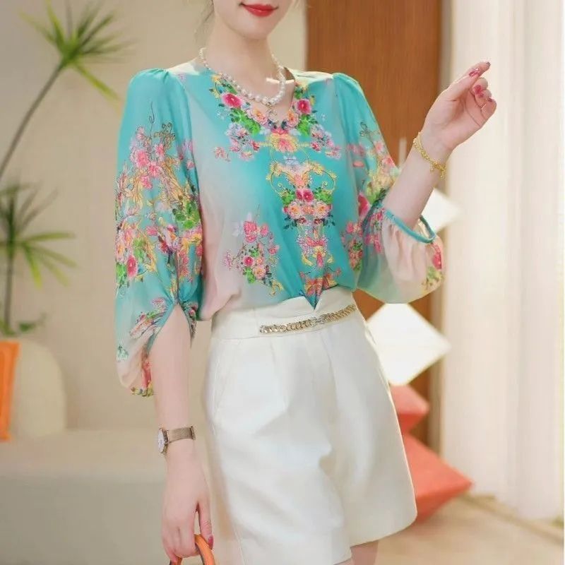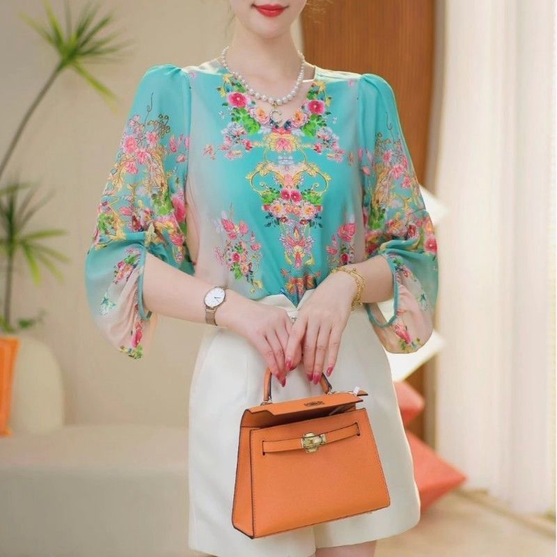 중년 및 노인 어머니의 느슨한 슬리밍 프린트 쉬폰 셔츠 여성 여름 신작 패션 캐주얼 7부 소매 탑