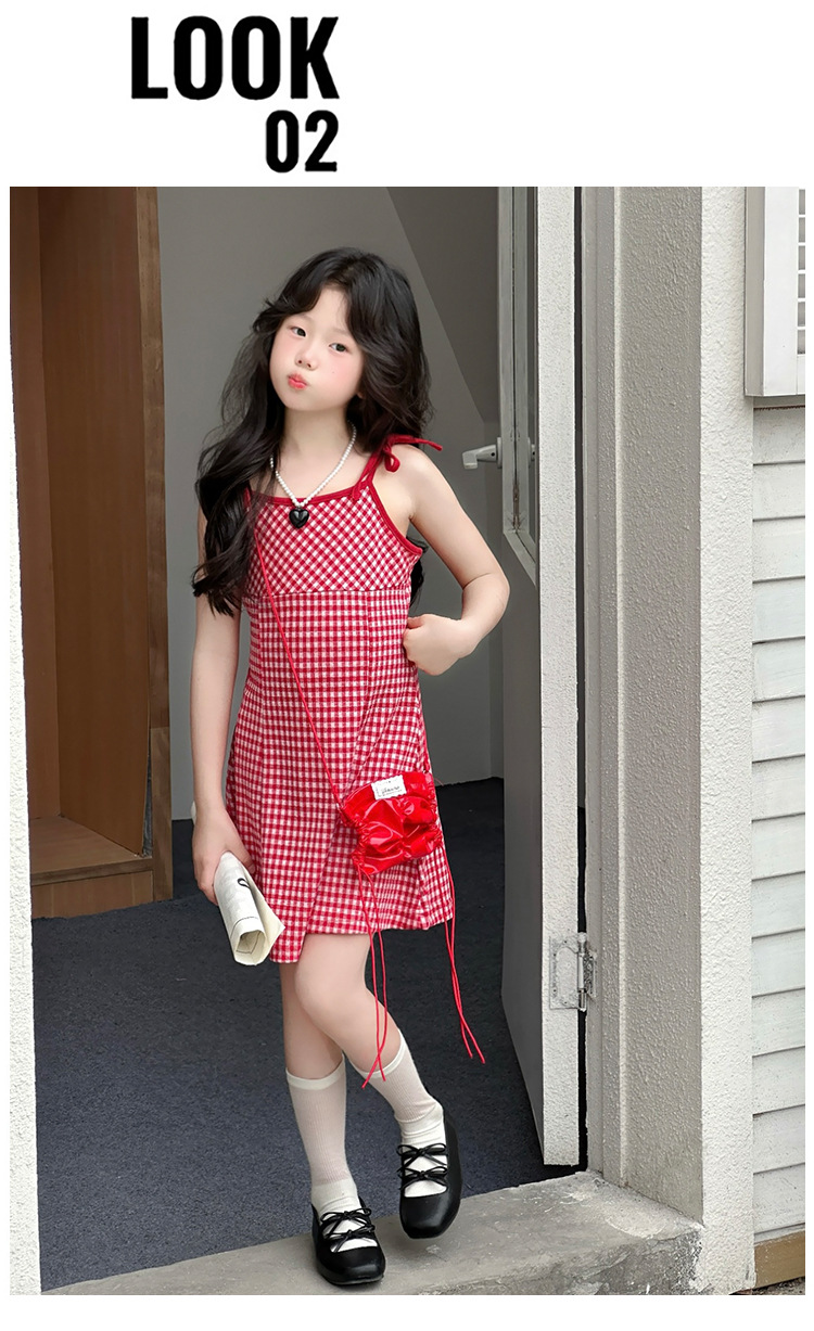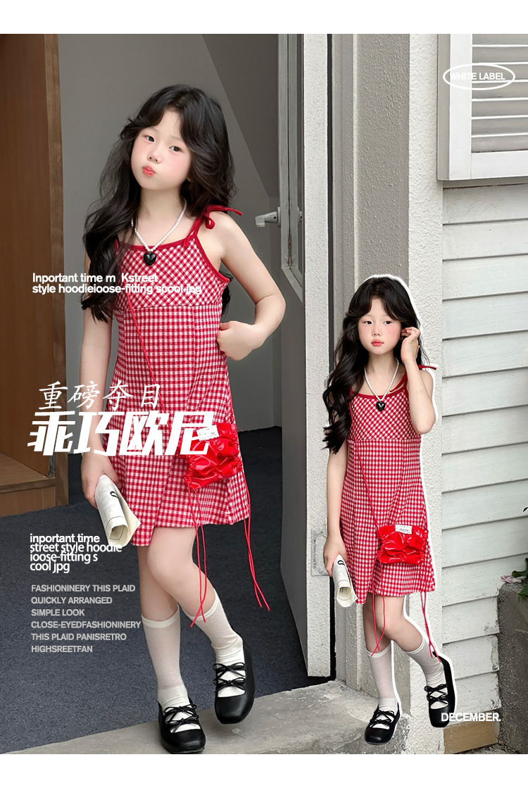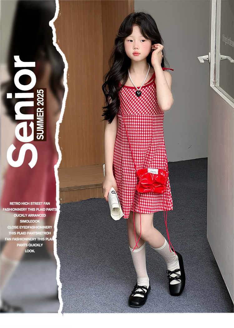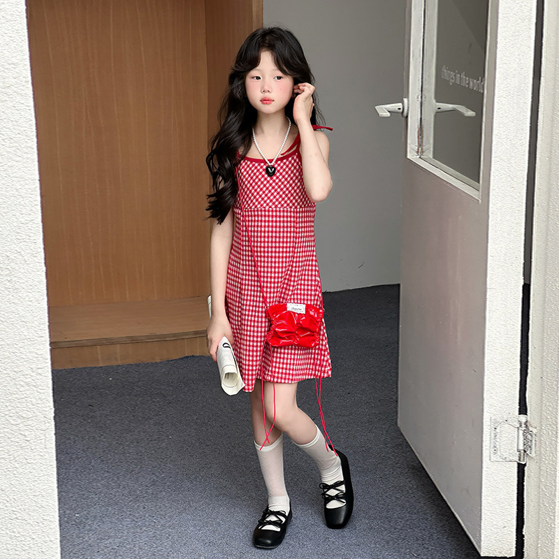 여자 원피스 여름 2025 새로운 한국 스타일 어린이 우아한 슬링 치마 소녀 여름 격자 무늬 공주 치마스토어 가기