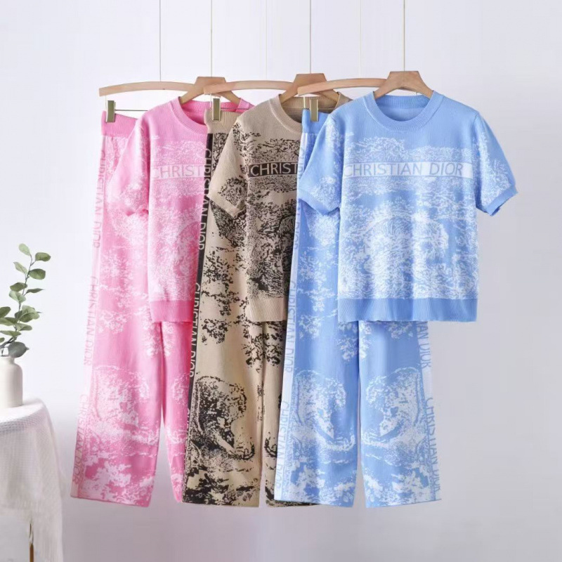 봄과 여름 새로운 둥근 목 편지 니트 동물 패턴 넓은 다리 바지 세트 2025 우아한 두 조각 세트스토어 가기