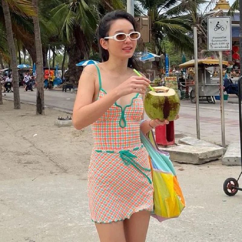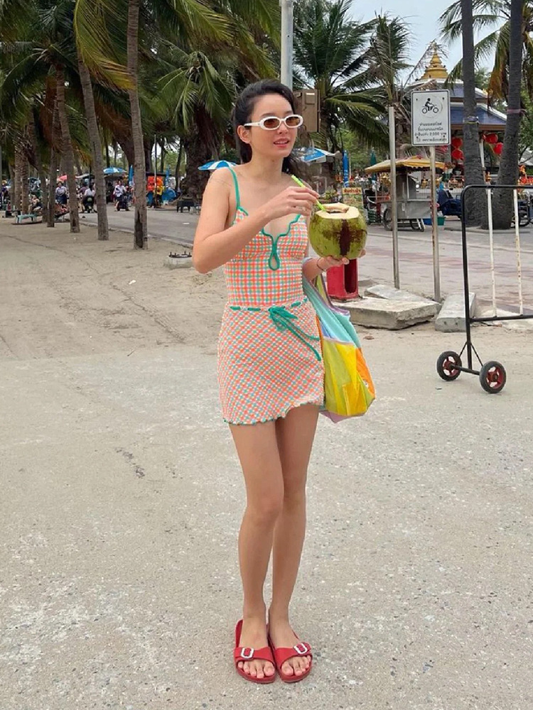 2024 원피스 수영복 여성용 체크 무늬 신선한 스커트 투피스 백리스 슬리밍 섹시한 순수 대외 무역 온천 수영복
