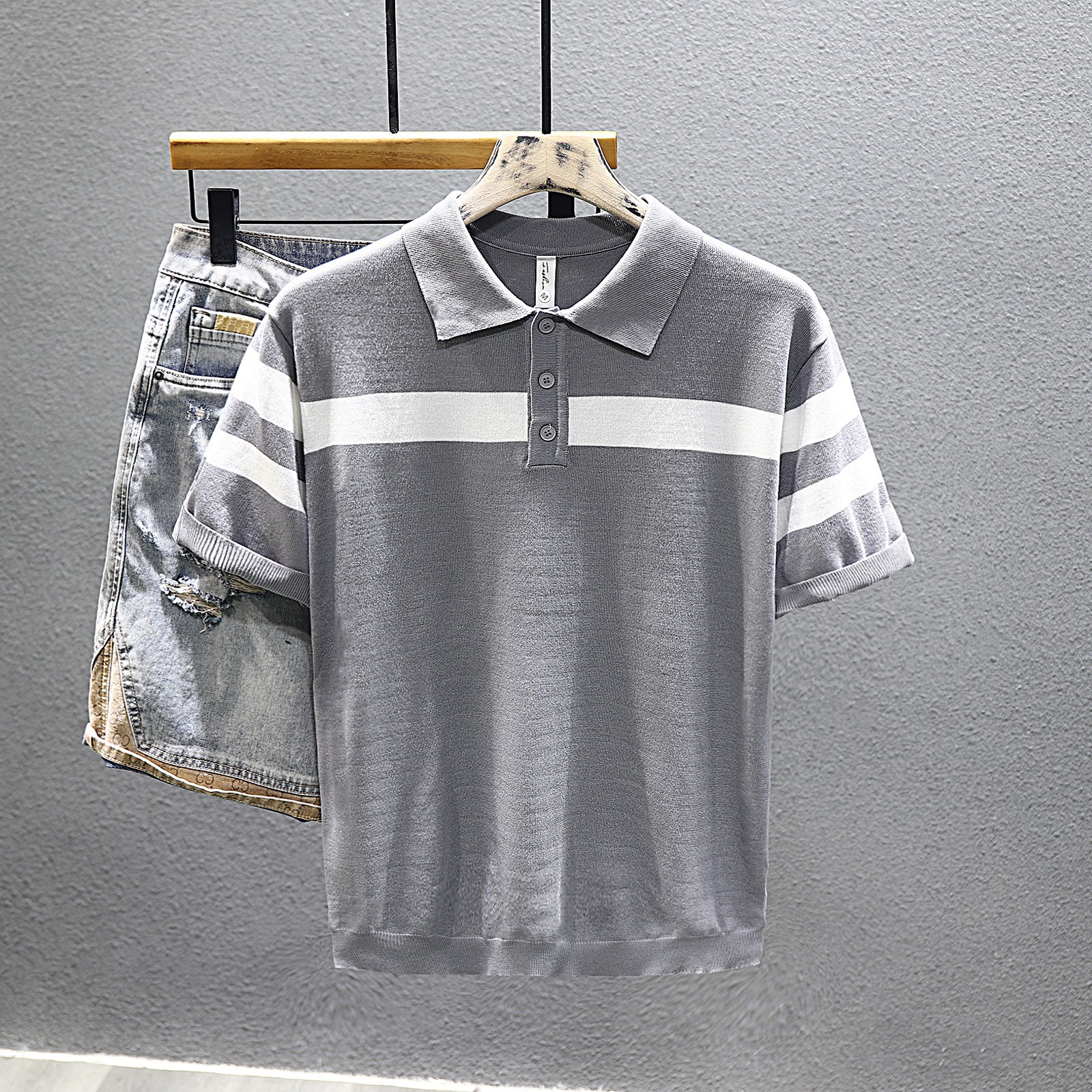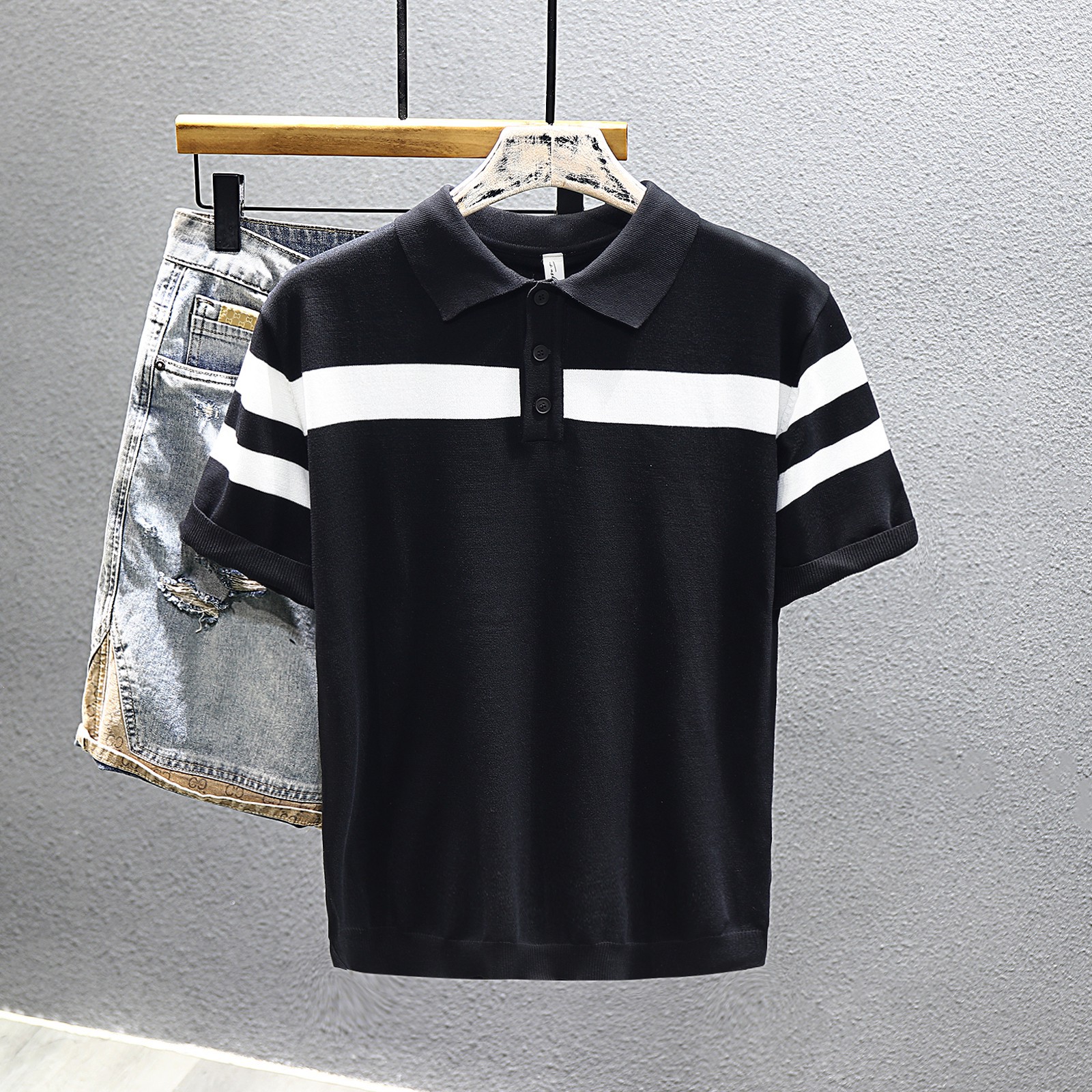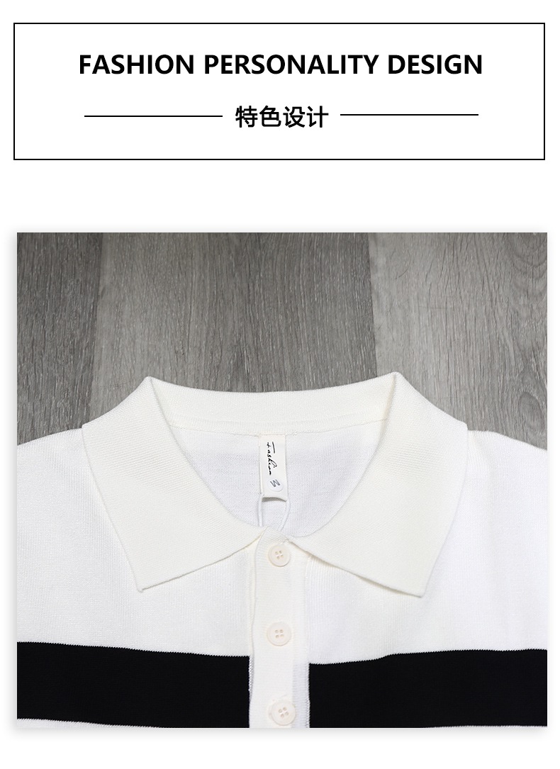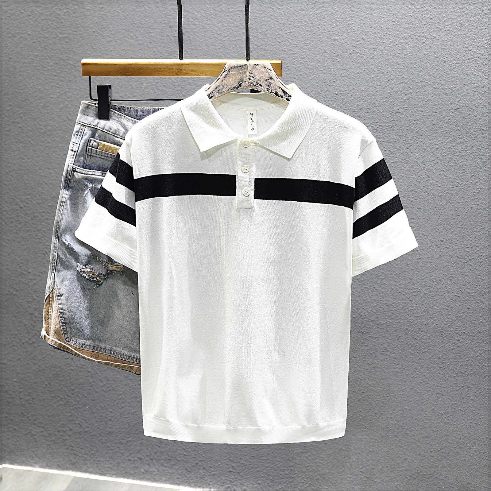 2025 새로운 여름 스타일 화이트 니트 반팔 탑 트렌디 브랜드 남성 대비 스트라이프 반팔 캐주얼 다용도 탑스토어 가기
