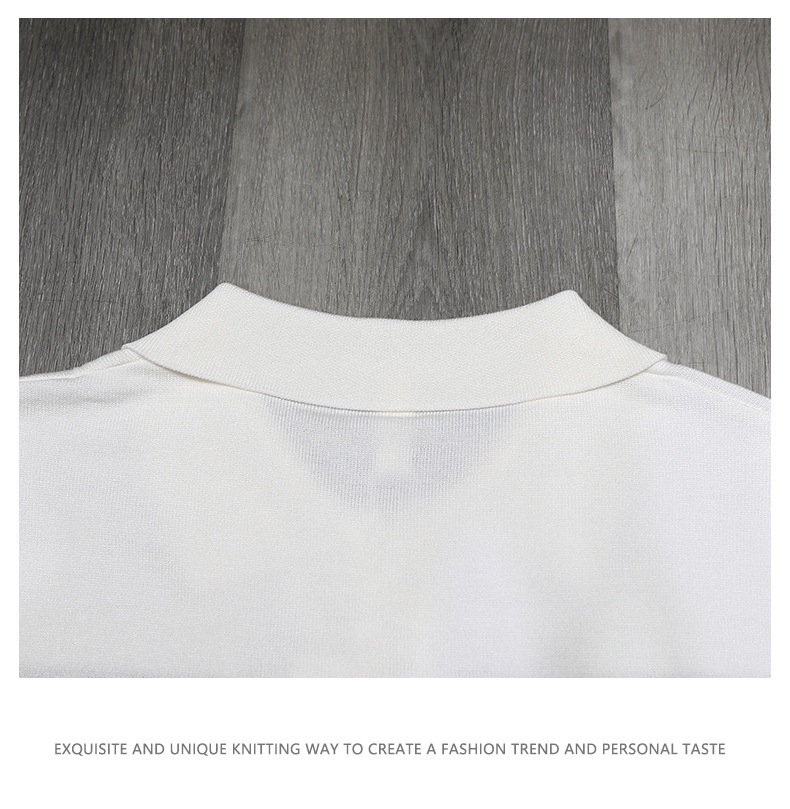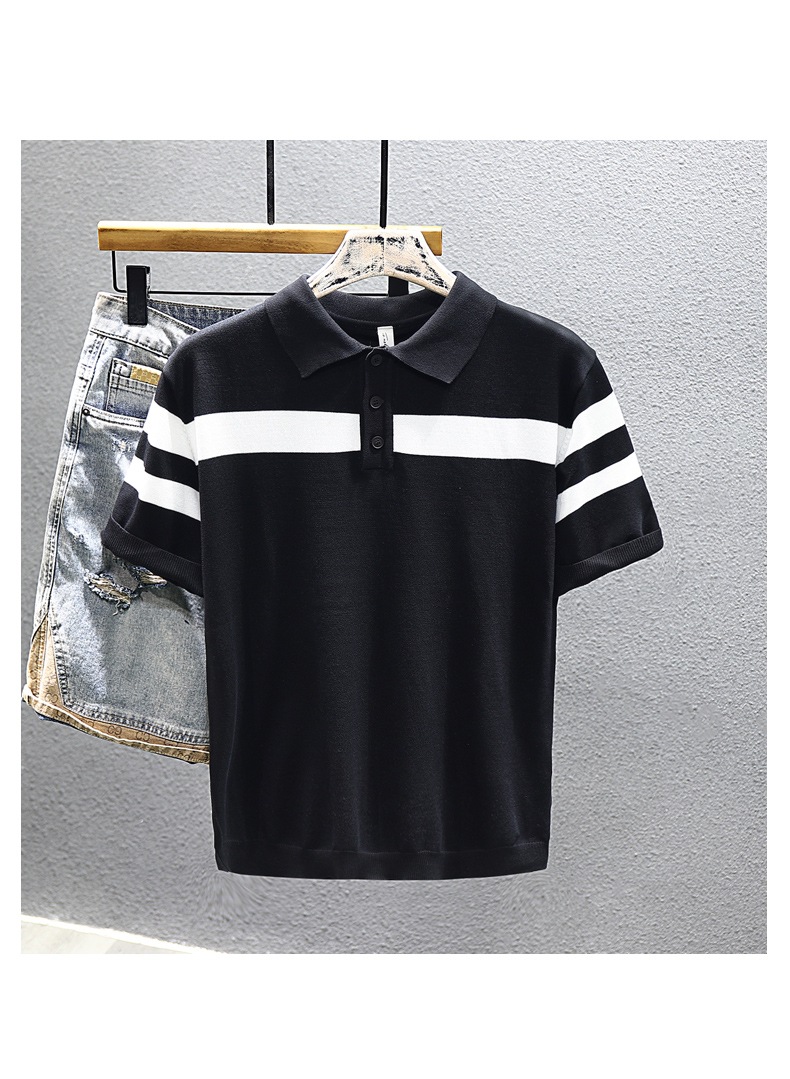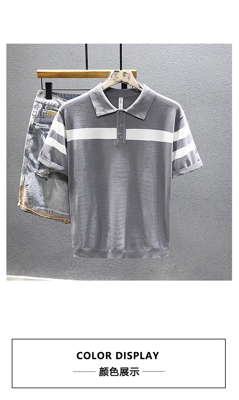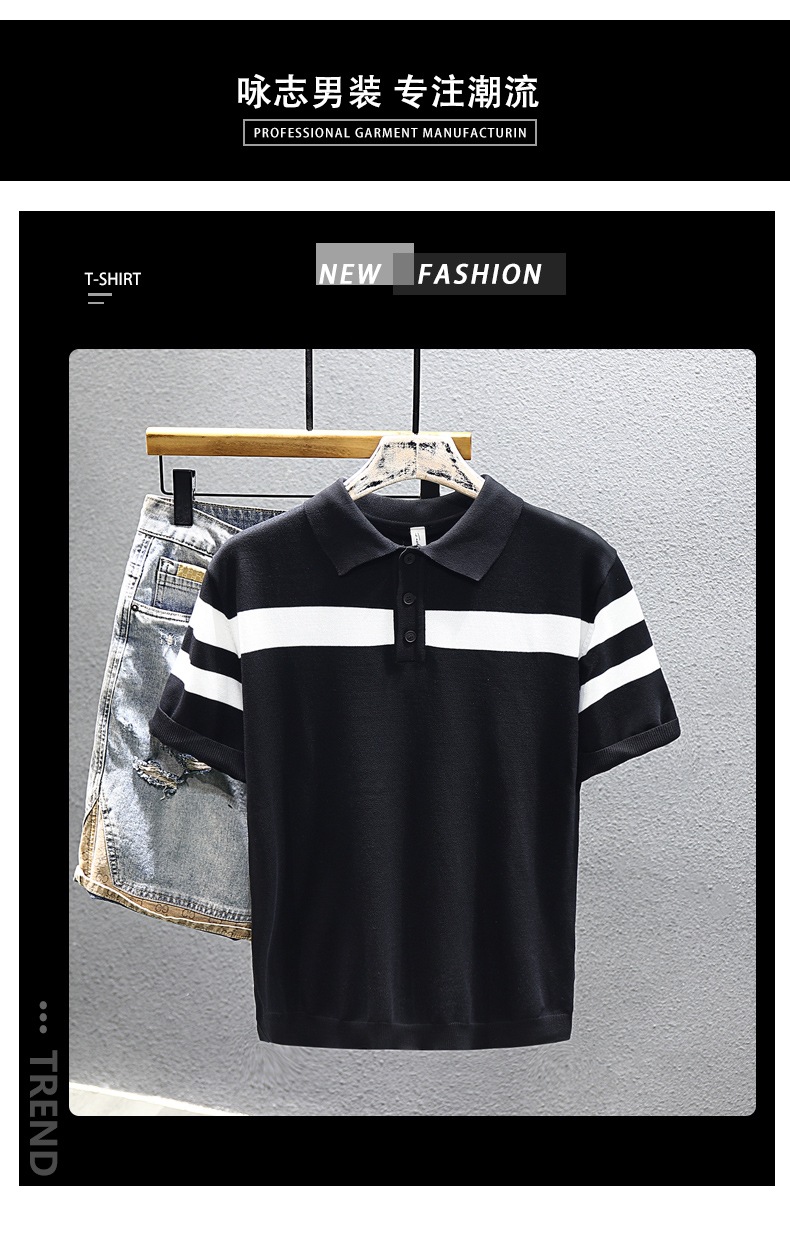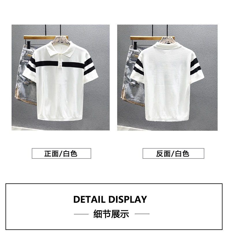 2025 새로운 여름 스타일 화이트 니트 반팔 탑 트렌디 브랜드 남성 대비 스트라이프 반팔 캐주얼 다용도 탑