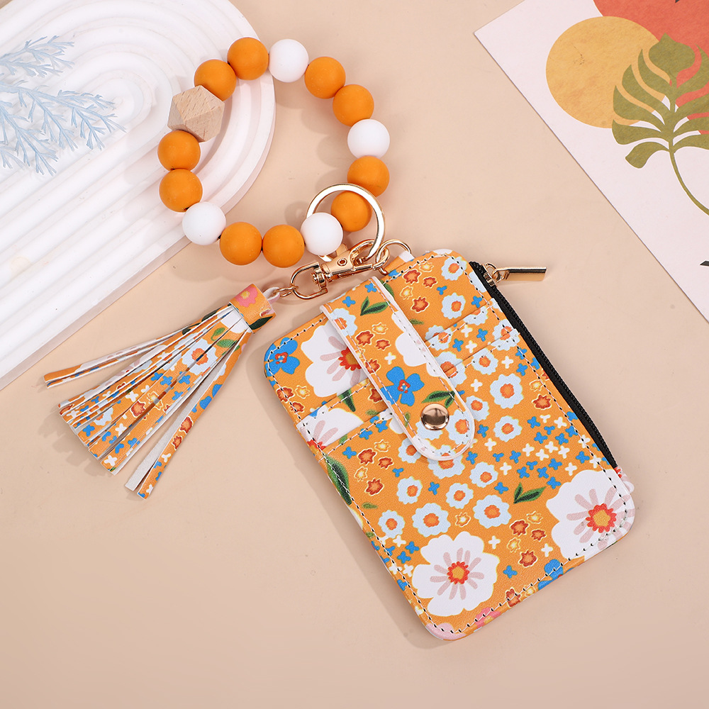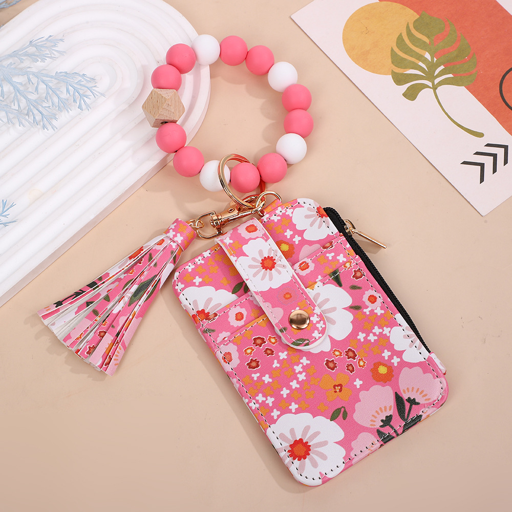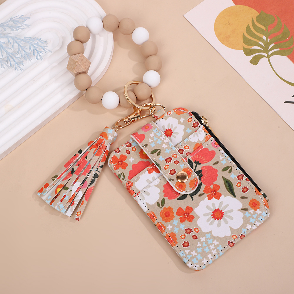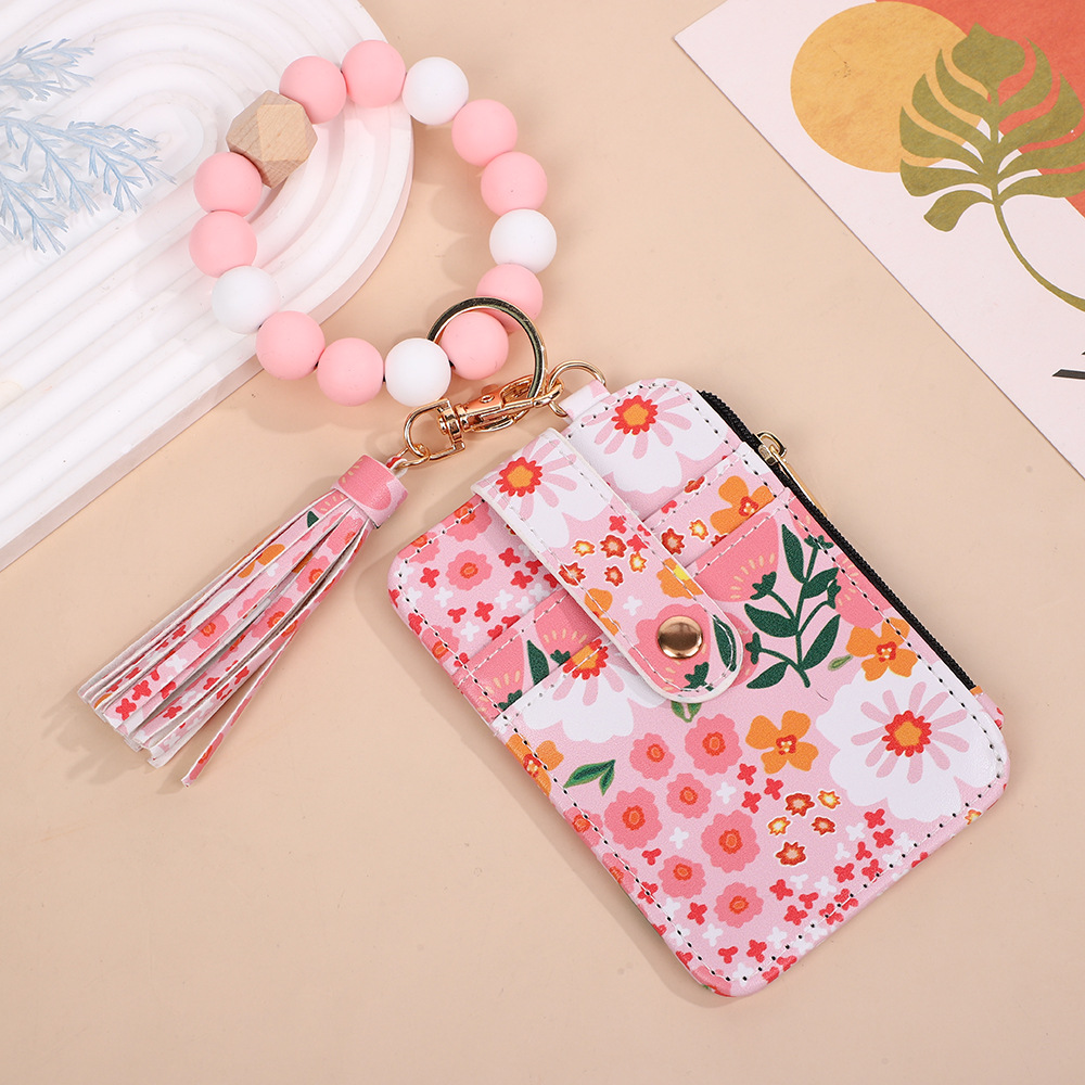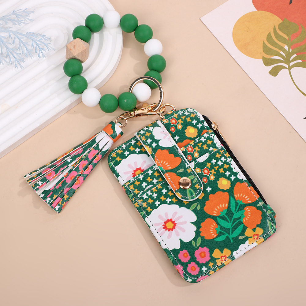 국경 간 인기 판매 패션 실리콘 팔찌 카드 홀더 유럽과 미국의 꽃 가죽 지퍼 동전 지갑 인쇄 가죽 키 체인