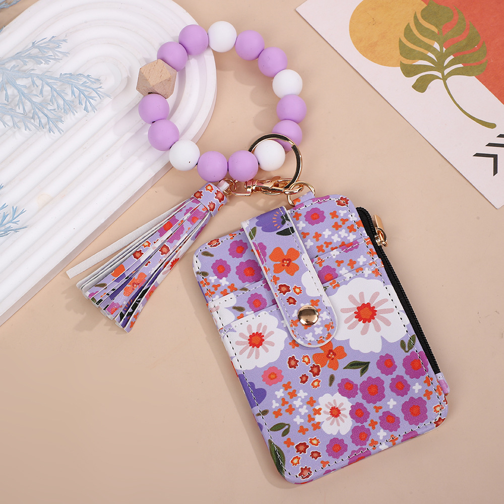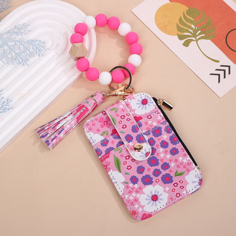 국경 간 인기 판매 패션 실리콘 팔찌 카드 홀더 유럽과 미국의 꽃 가죽 지퍼 동전 지갑 인쇄 가죽 키 체인스토어 가기