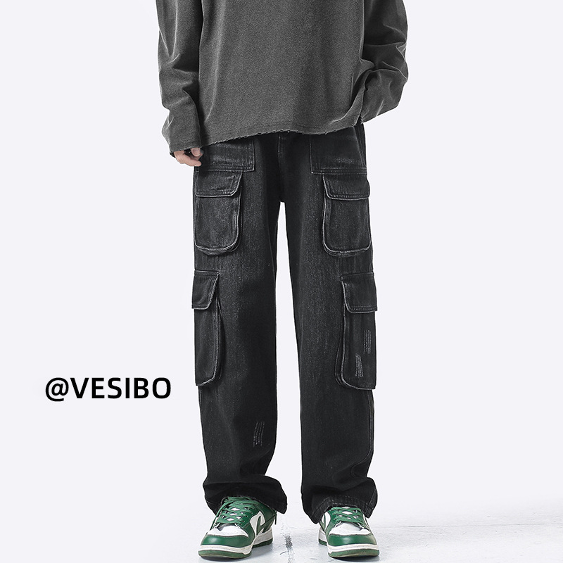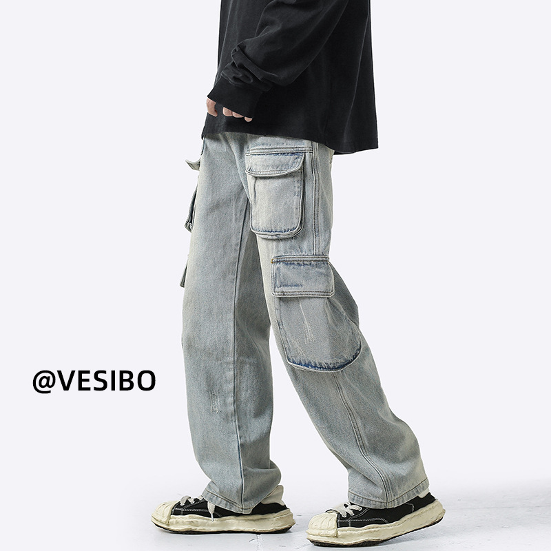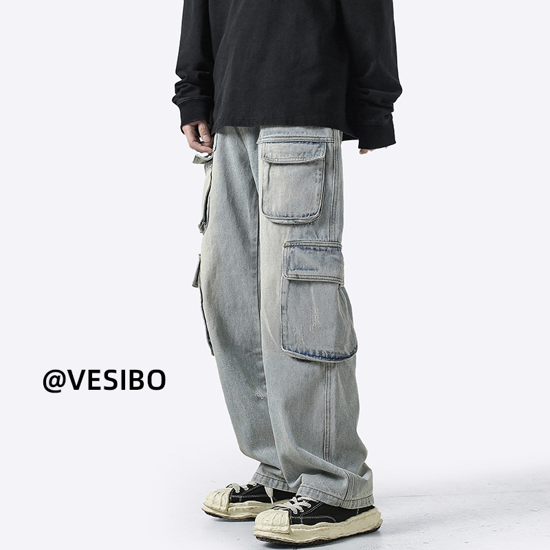 아메리칸 레트로 워싱 청바지 남성 여름 얇은 멀티 포켓 작업복 와이드 팬츠 디자인 루즈 롱 팬츠