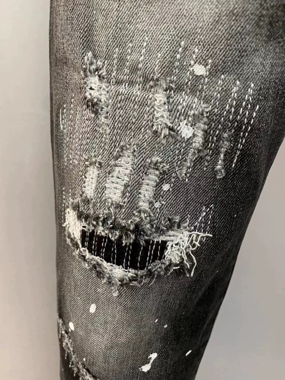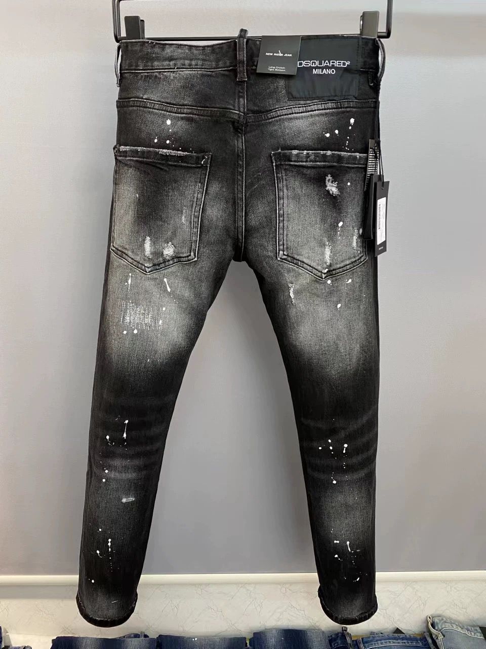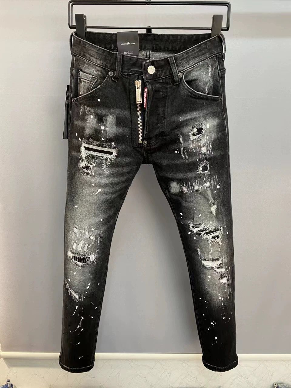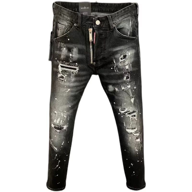 봄과 여름 2025 새로운 D2 트렌디 한 남성용 세척 된 그라인딩 패치 페인트 슬림 핏 마이크로 탄성 다리 블랙 청바지 남성용스토어 가기