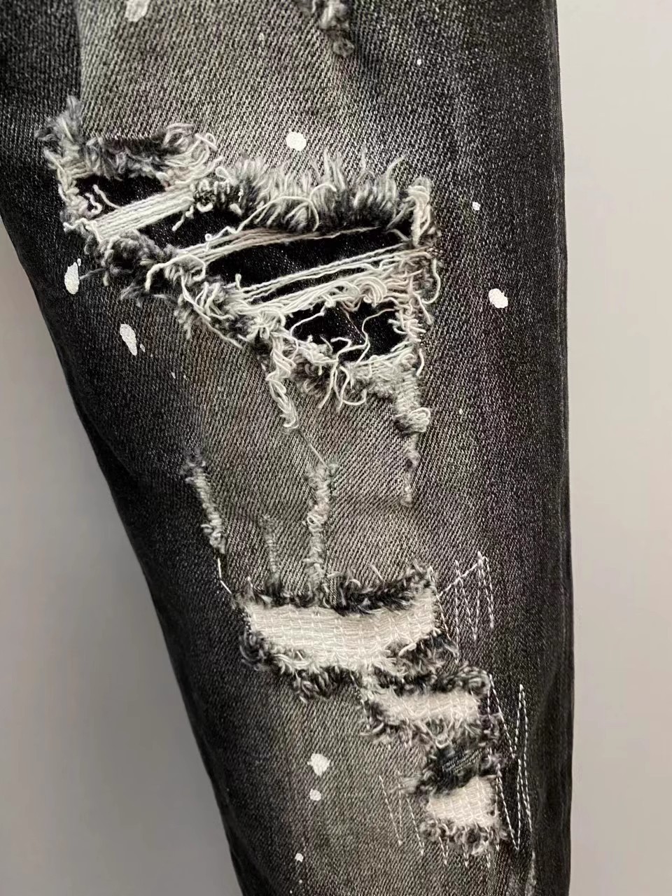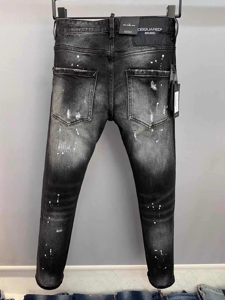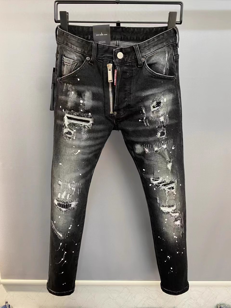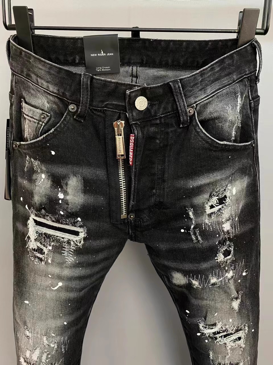 봄과 여름 2025 새로운 D2 트렌디 한 남성용 세척 된 그라인딩 패치 페인트 슬림 핏 마이크로 탄성 다리 블랙 청바지 남성용스토어 가기