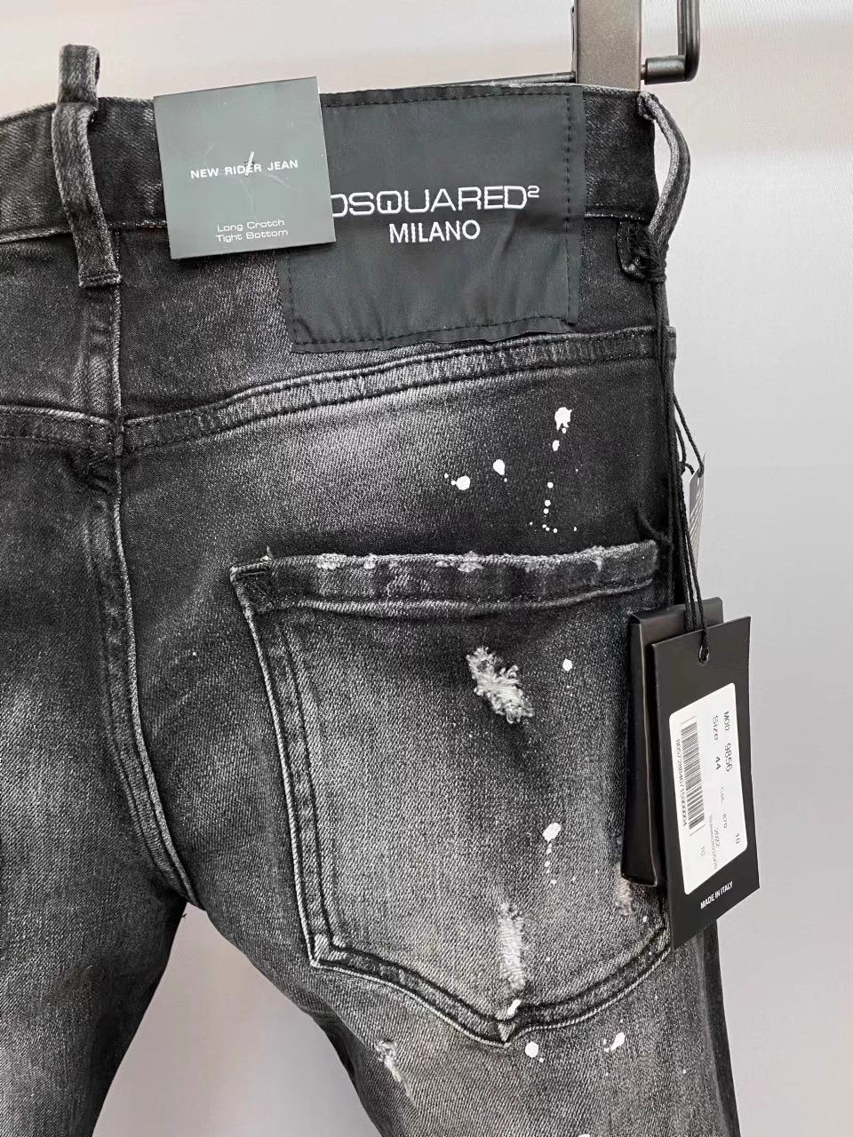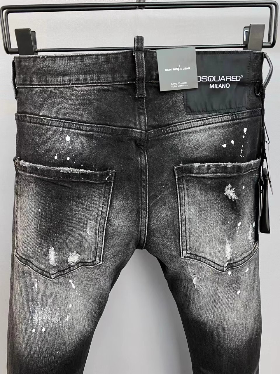 봄과 여름 2025 새로운 D2 트렌디 한 남성용 세척 된 그라인딩 패치 페인트 슬림 핏 마이크로 탄성 다리 블랙 청바지 남성용