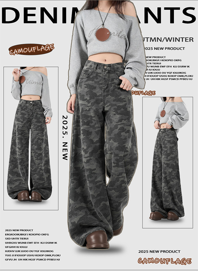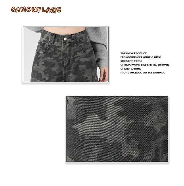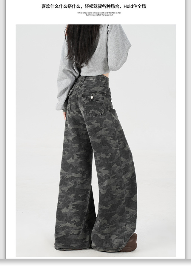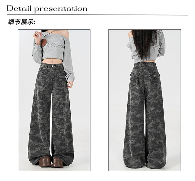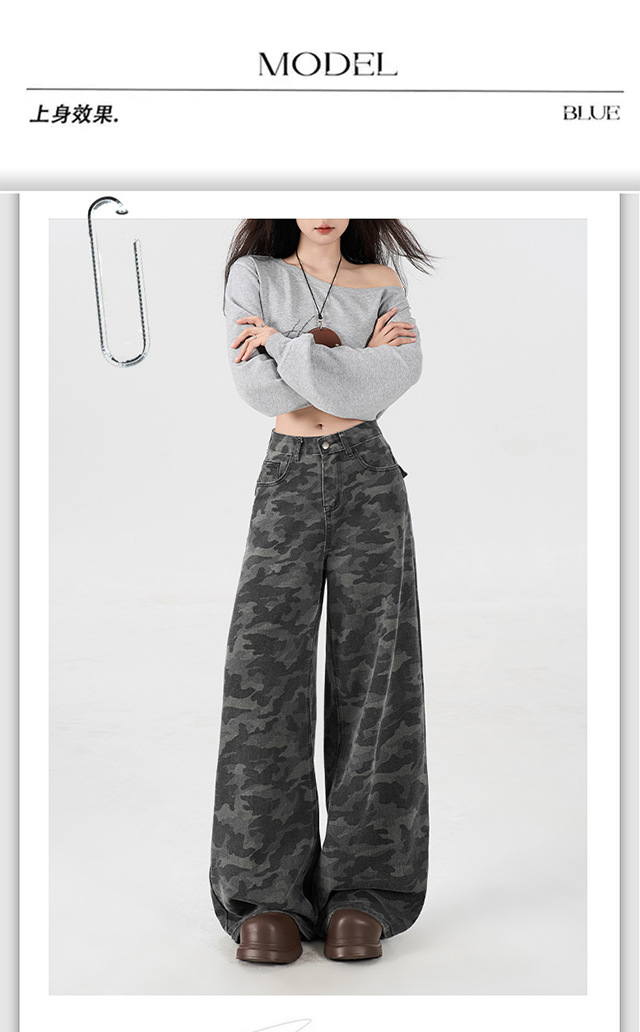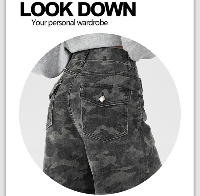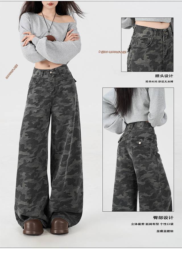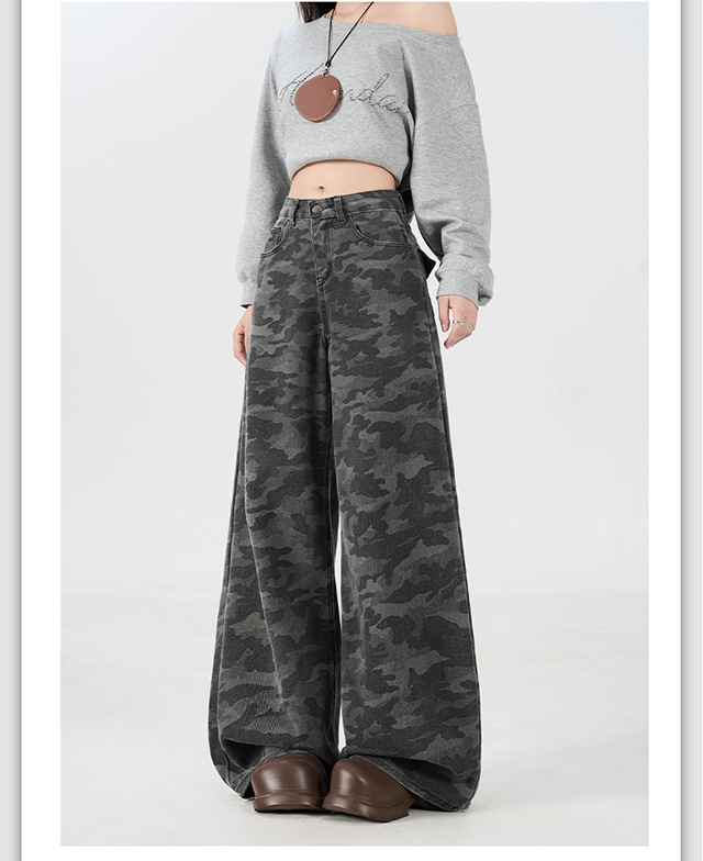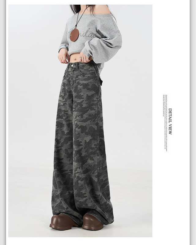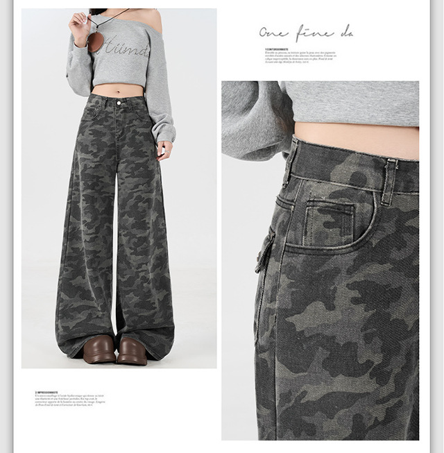 아메리칸 스타일 하이 스트리트 툴링 와이드 레그 위장 청바지 여성용 여름 복고풍 높은 허리 느슨한 슬리밍 스트레이트 팬츠스토어 가기