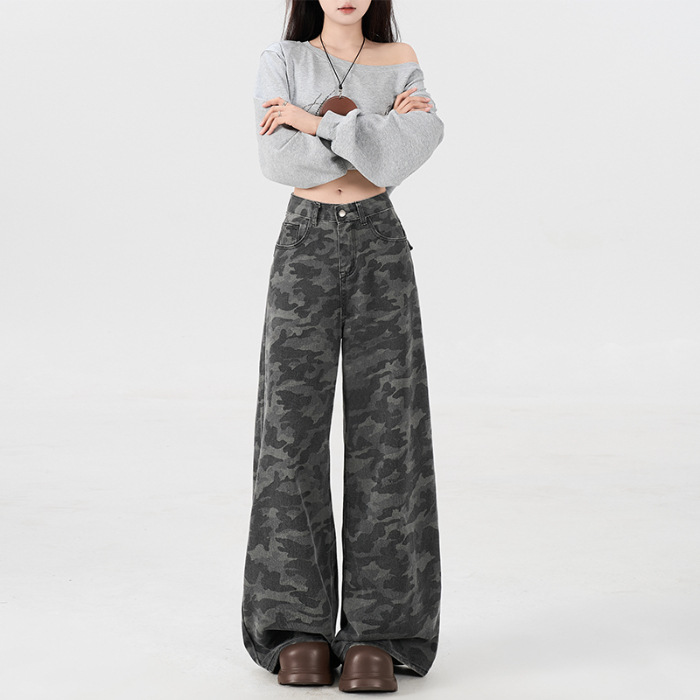 아메리칸 스타일 하이 스트리트 툴링 와이드 레그 위장 청바지 여성용 여름 복고풍 높은 허리 느슨한 슬리밍 스트레이트 팬츠