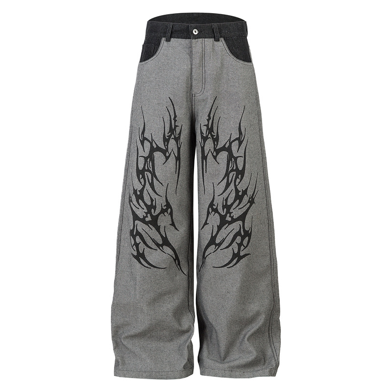 컬러 블록 허리 디자인 블레이드 토템 자수 리버스 블랙 워싱 루즈 배기 와이드 레그 청바지 남성용