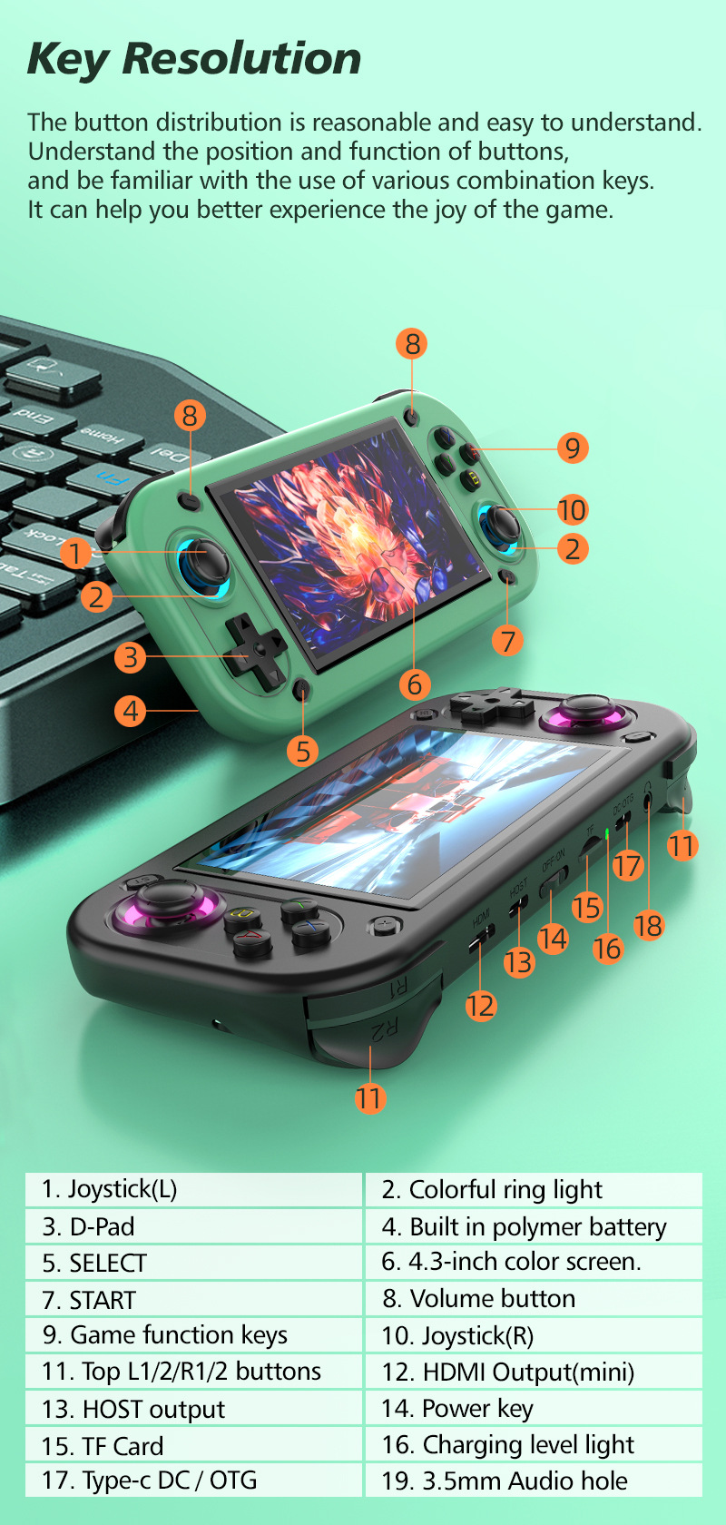 其他功能:支持外接手柄实现双人对战,支持3.5mm 耳机,双3D立体摇杆