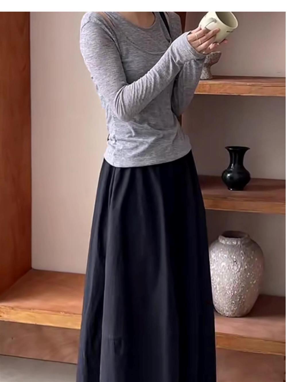 검은 꽃 버드 스커트 여성의 초가을 2024 새로운 스타일 구부러진 허리 커버 슬리밍 높은 허리 중간 길이 긴 스커트