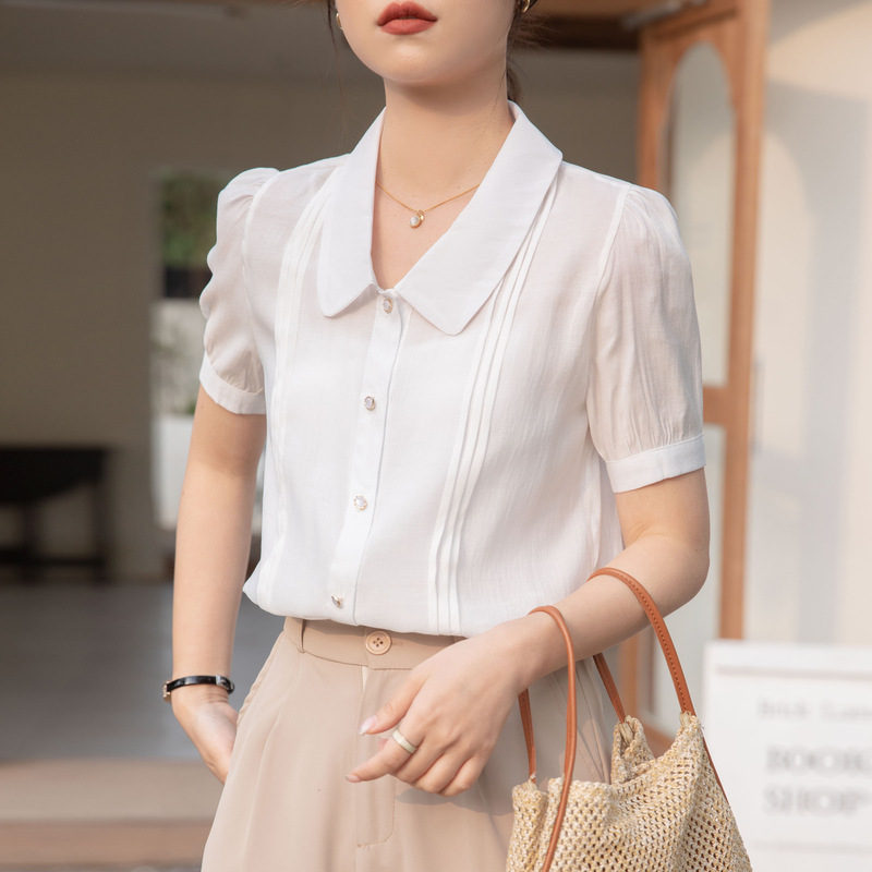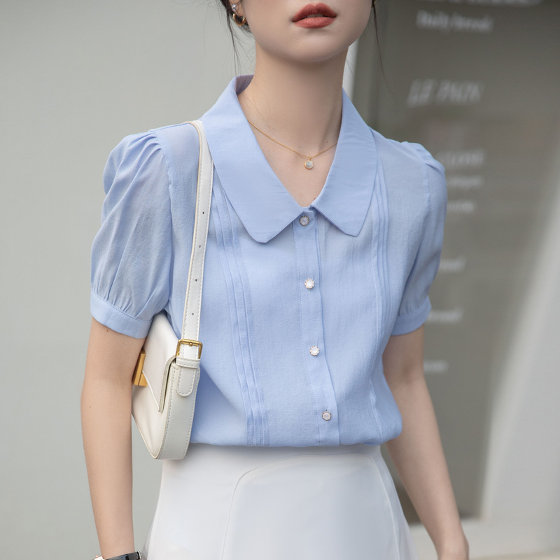 프랑스 스타일 레트로 버블 반팔 옷깃 셔츠 여성의 여름 새로운 스타일 디자인 서양식 올 매치 통근 전문 셔츠