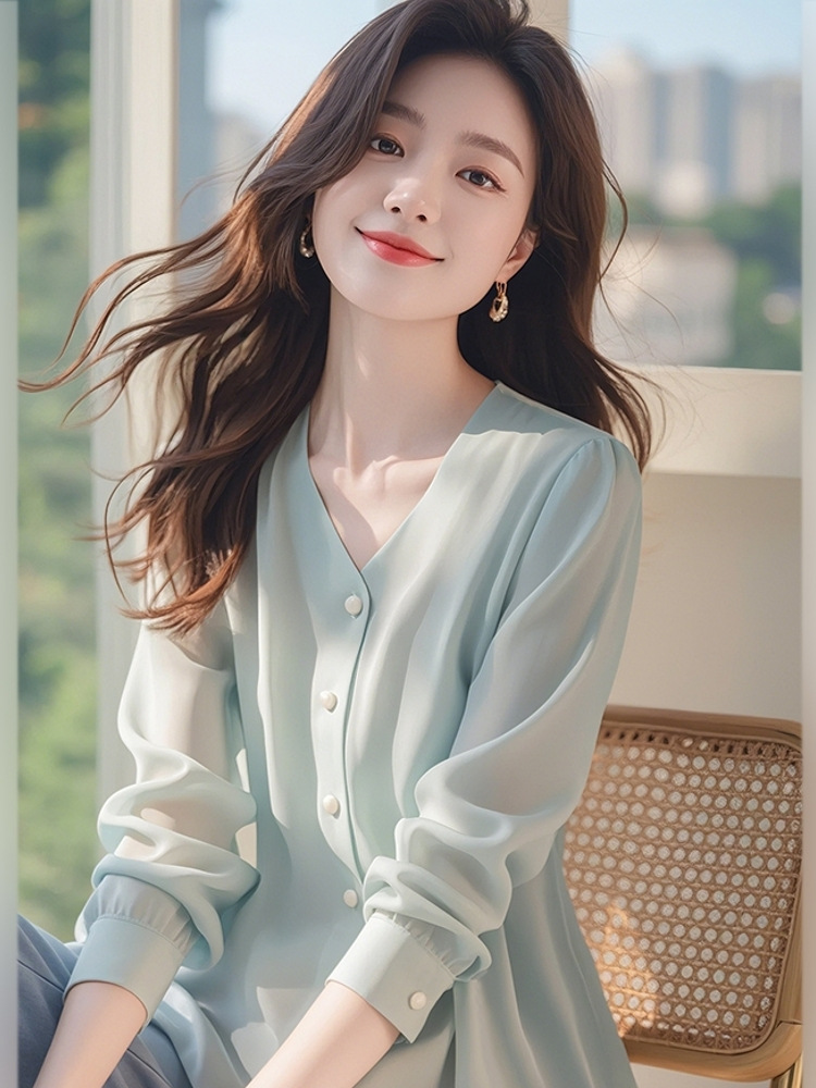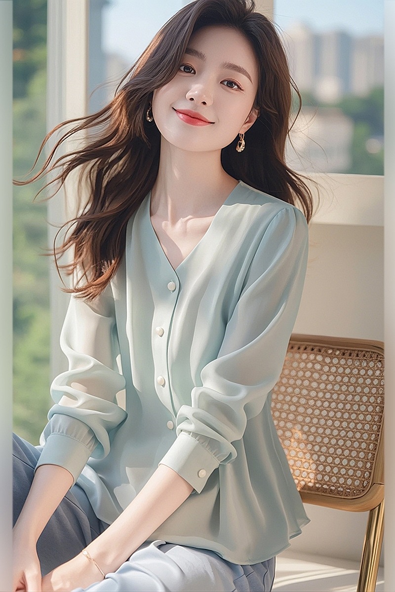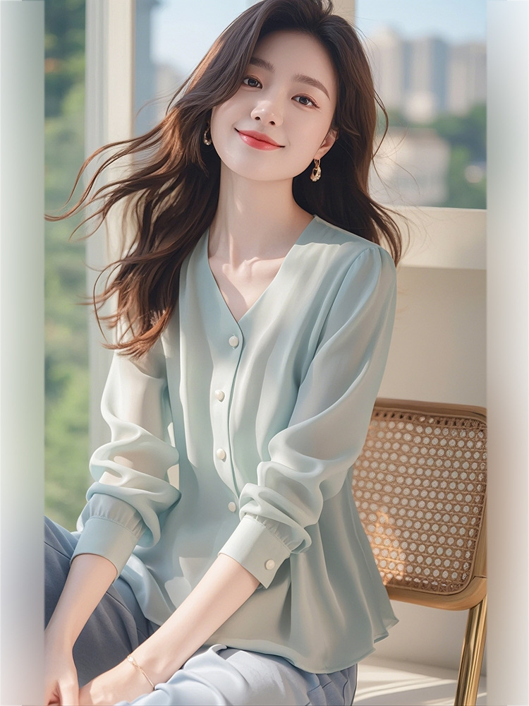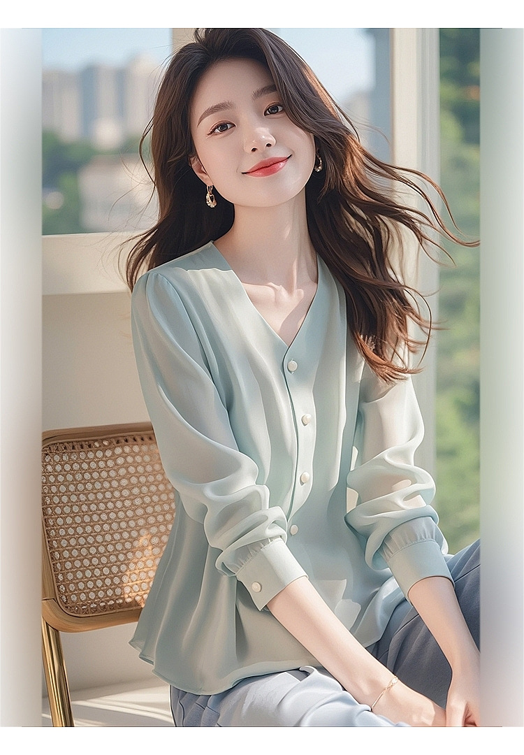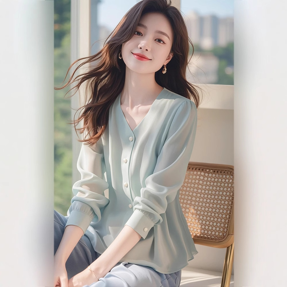 이른 가을 새로운 서양 스타일 하이 엔드 Chic Belly 커버 쉬폰 셔츠 슈퍼 잘 생긴 V 넥 프랑스 여성을위한 아름다운 작은 탑