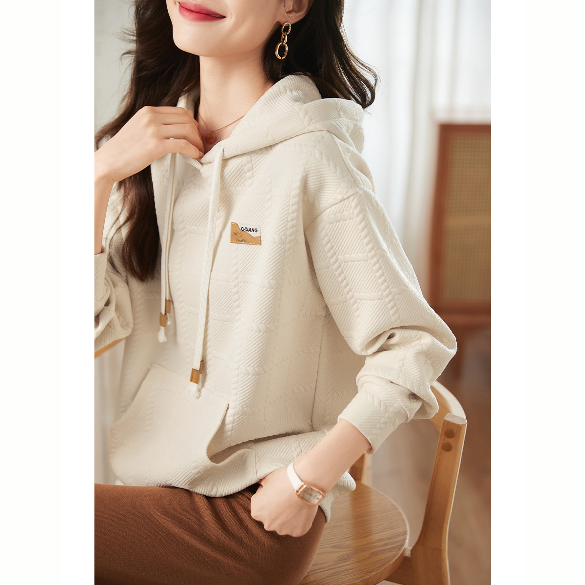 2023 년 가을을위한 간단한 신선한 와플리 후드 땀 새로운 현악기 라벨링 연령 감소 긴 소매 탑