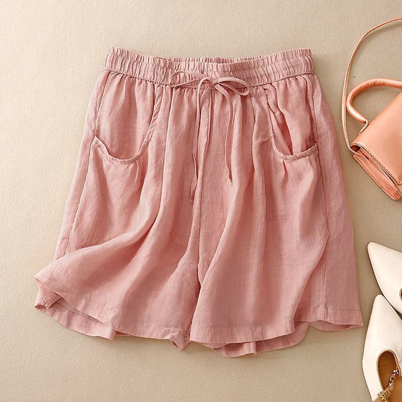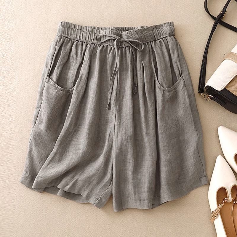 여름 신작 캐주얼 와이드 레그 반바지, 시원한 면 및 린넨 드로스트링, 얇은 스트랩 포켓 디자인, 여성용 얇은 단색 바지