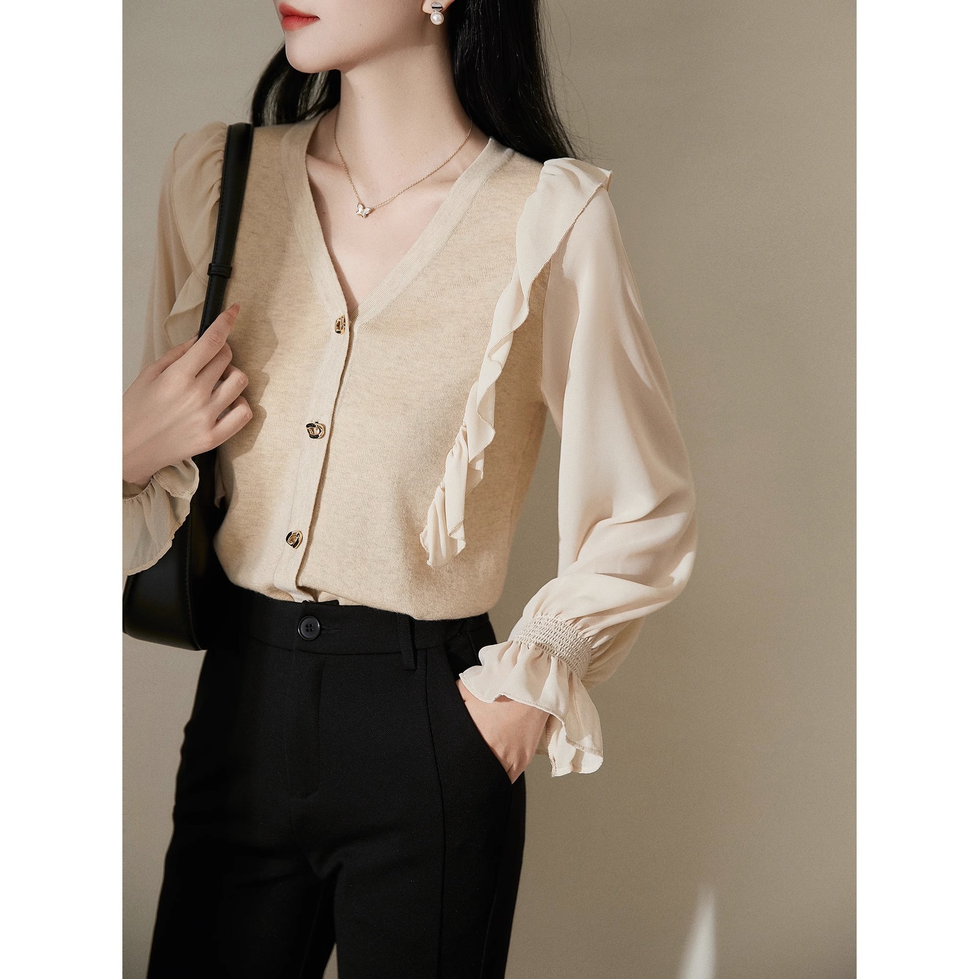 가을 2023 새로운 스타일 우아한 바늘 셔틀 스티칭 V-Neck 긴팔 레이스 여성용 니트 카디건