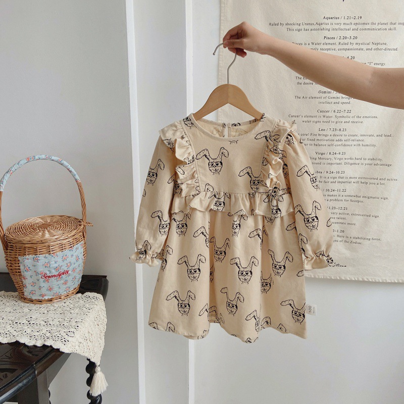 한국 아동복 곰 프린트 긴 소매 소녀의 원피스 2023 가을 달콤한 주름진 승무원 유행 어린이 원피스스토어 가기
