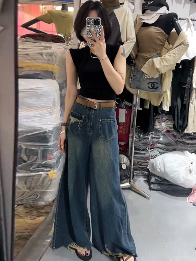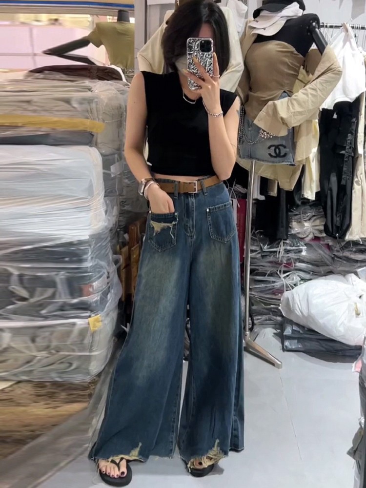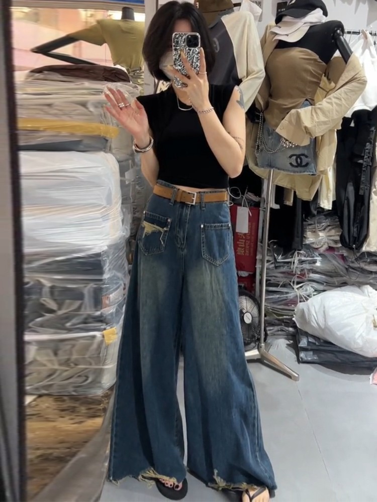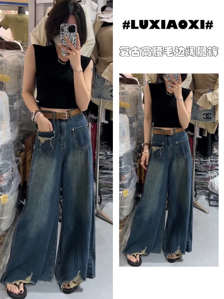复古高腰磨破毛边牛仔裤女2023年秋季新款宽松显瘦遮肉垂感阔腿裤스토어 가기