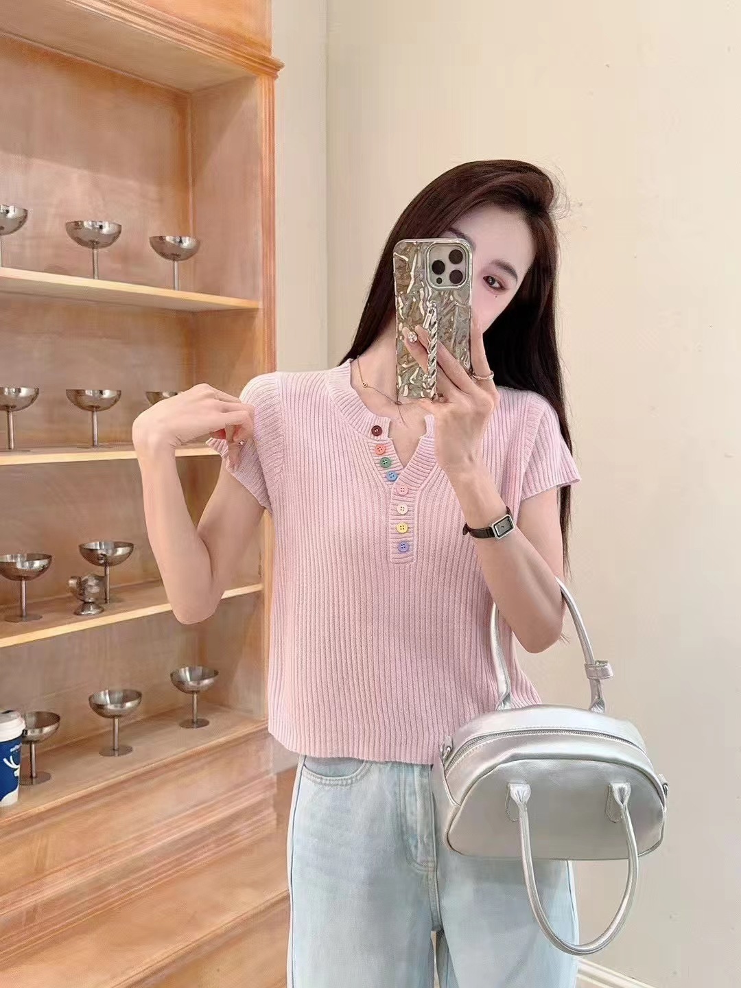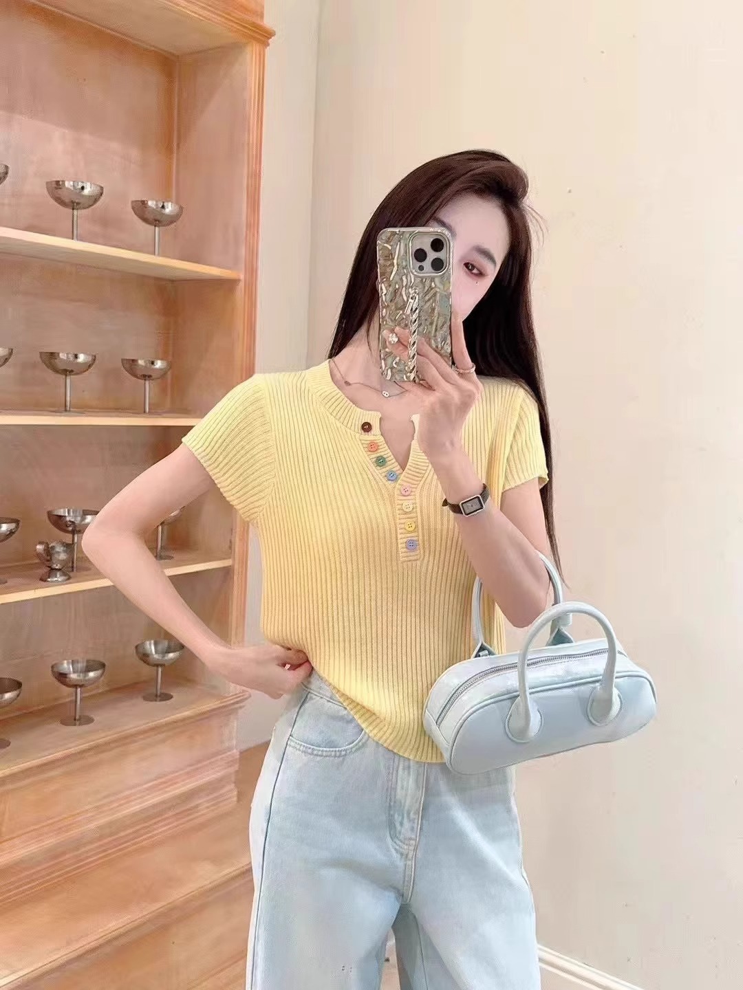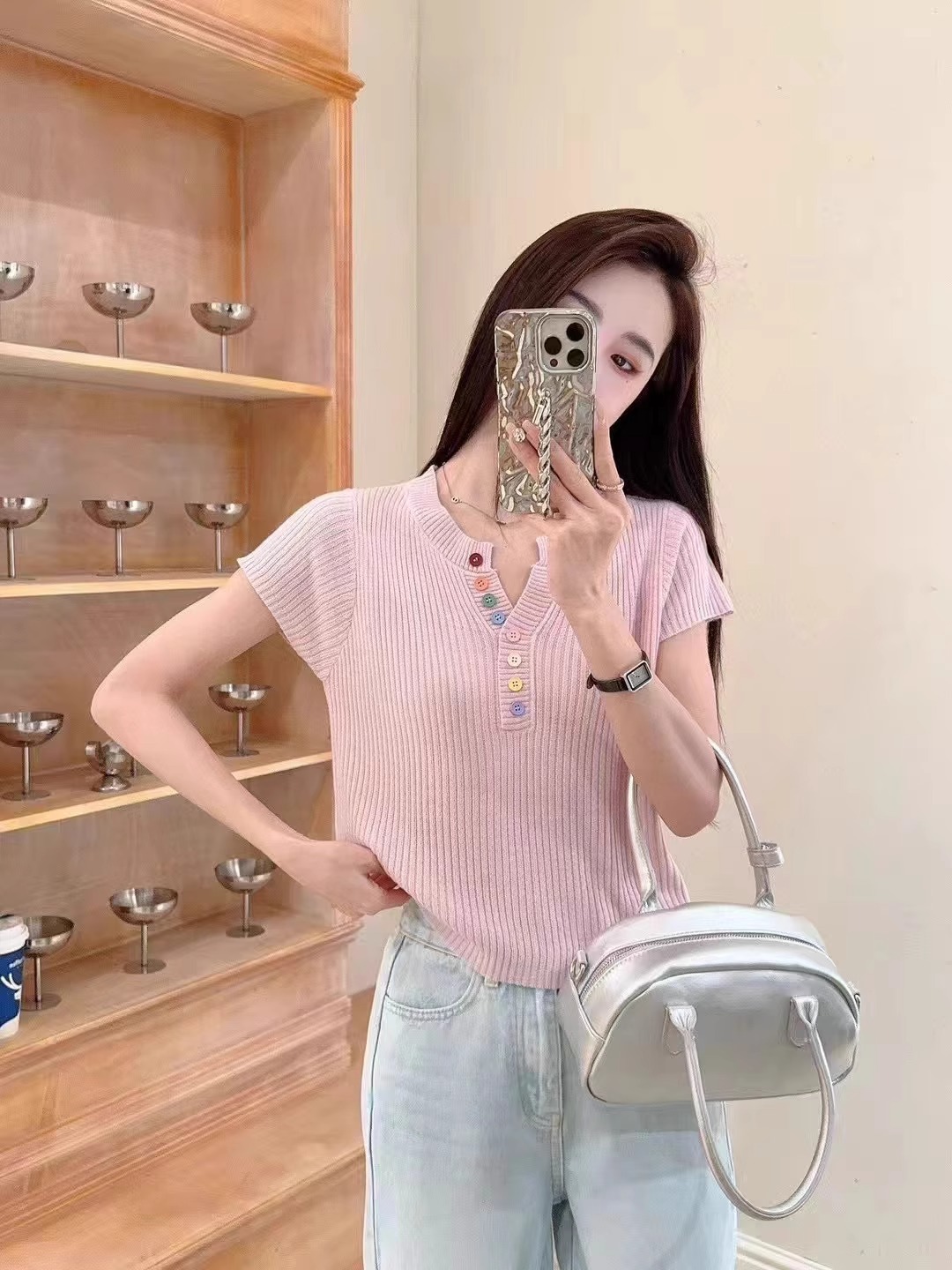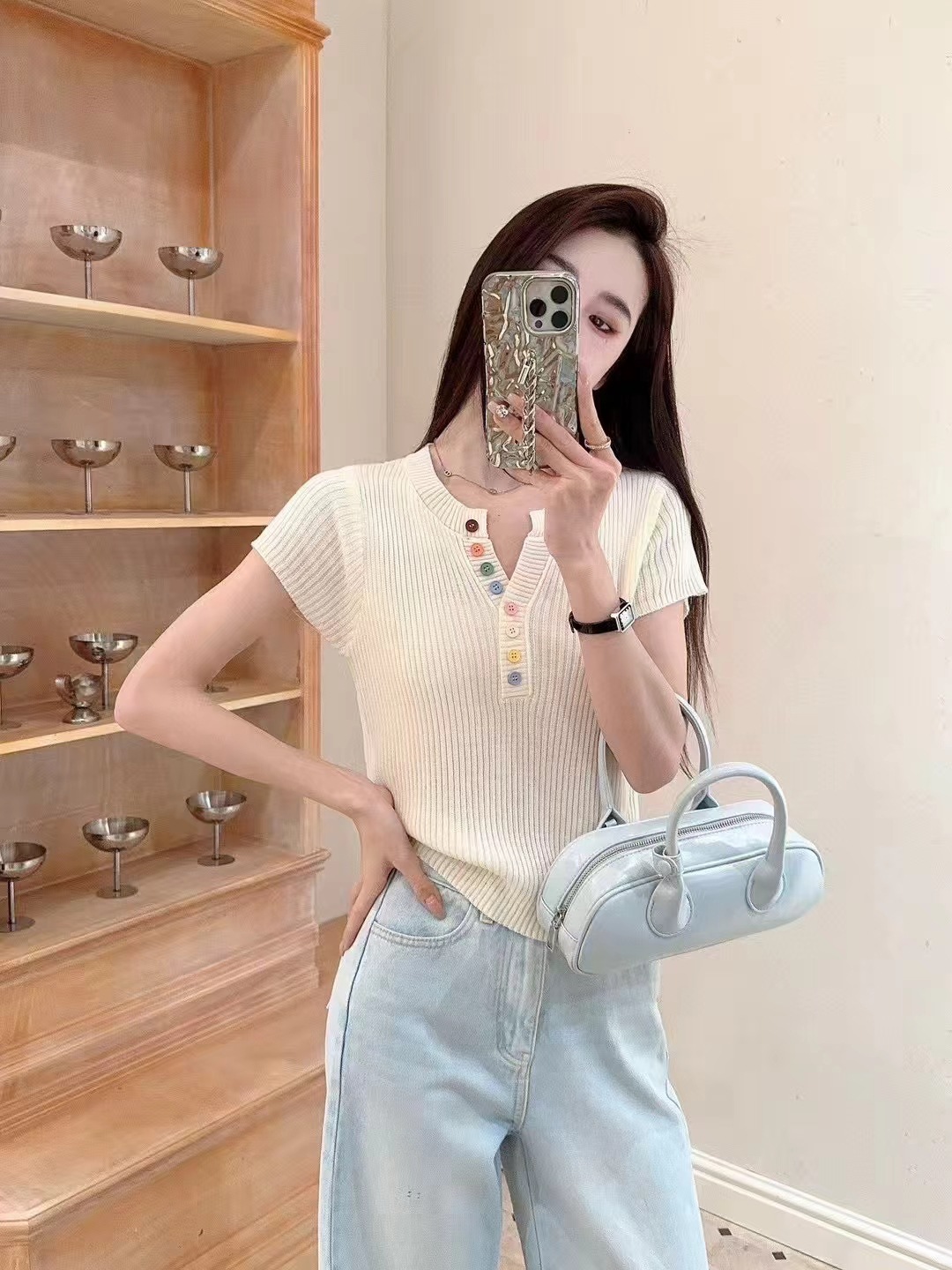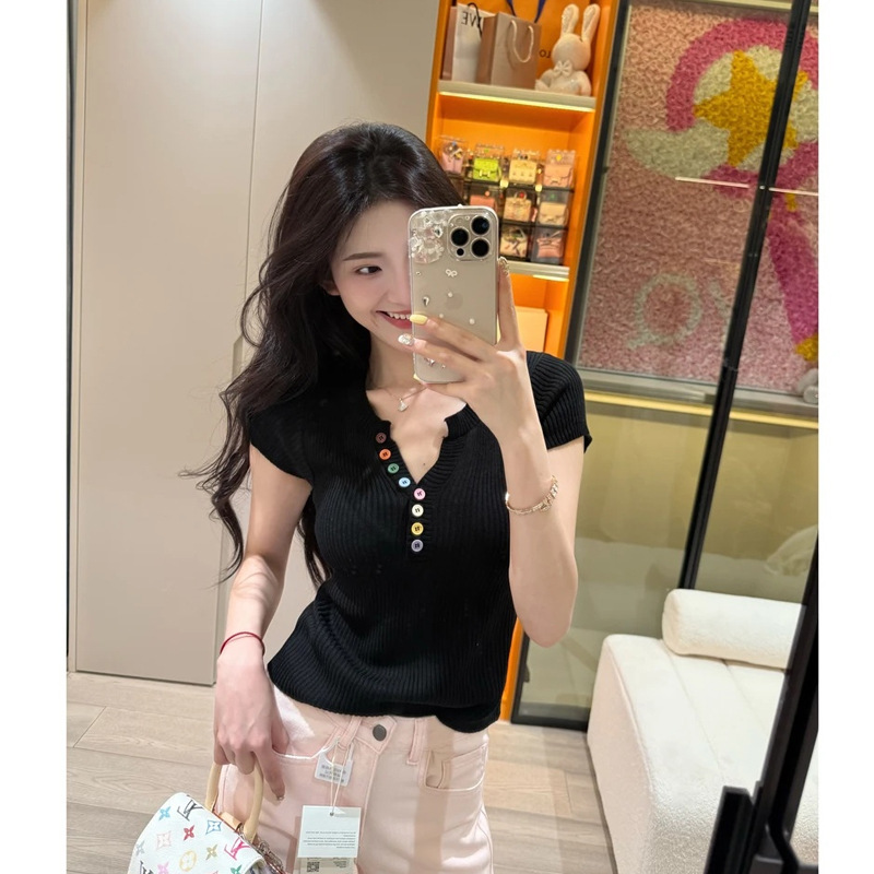 부드러운 피부 친화적 인 반팔 티셔츠 스웨터 여름 서양식 올 매치 캐주얼 다채로운 버튼 세련된 슬림 핏 탑