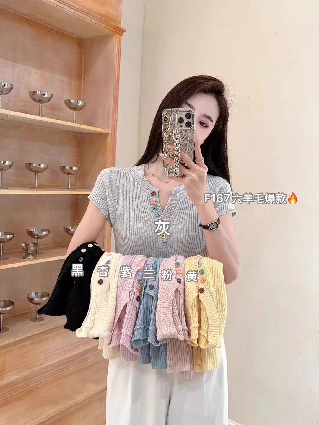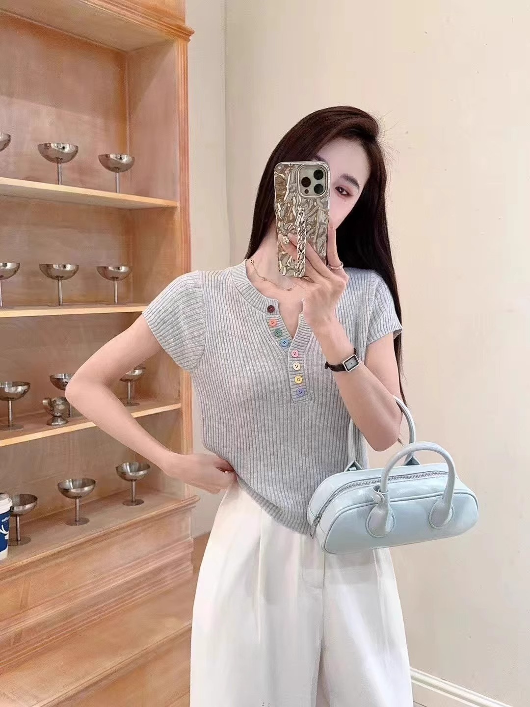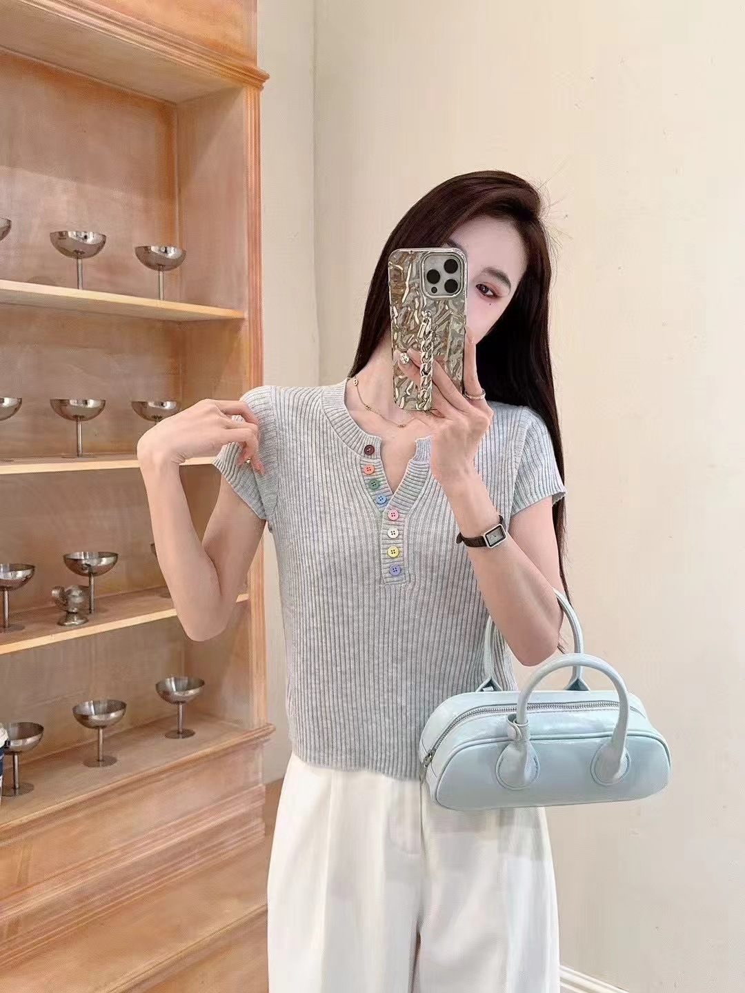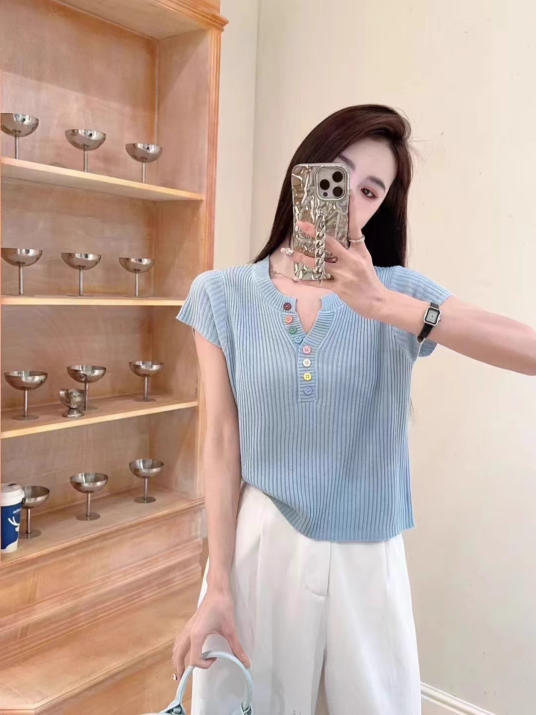 부드러운 피부 친화적 인 반팔 티셔츠 스웨터 여름 서양식 올 매치 캐주얼 다채로운 버튼 세련된 슬림 핏 탑
