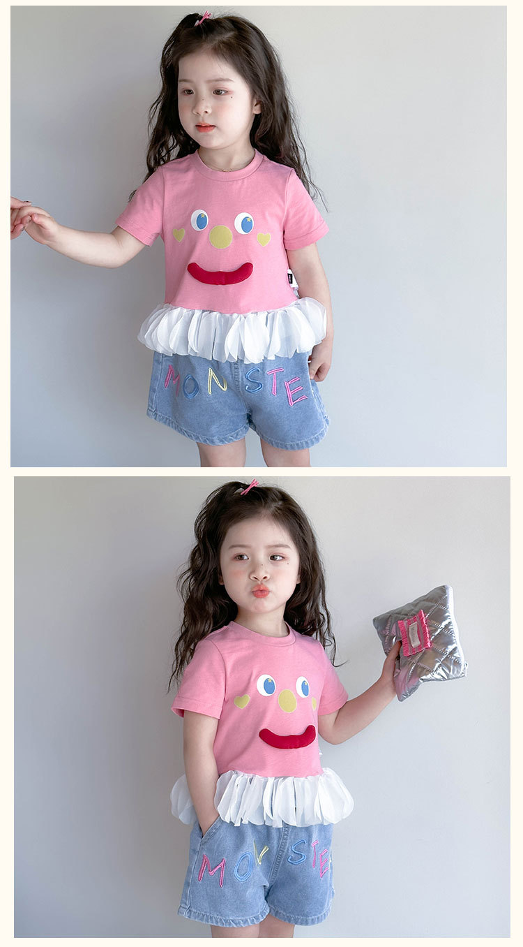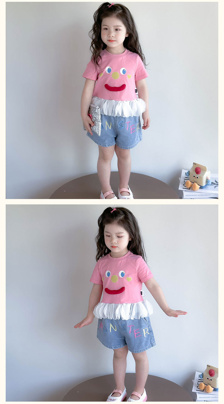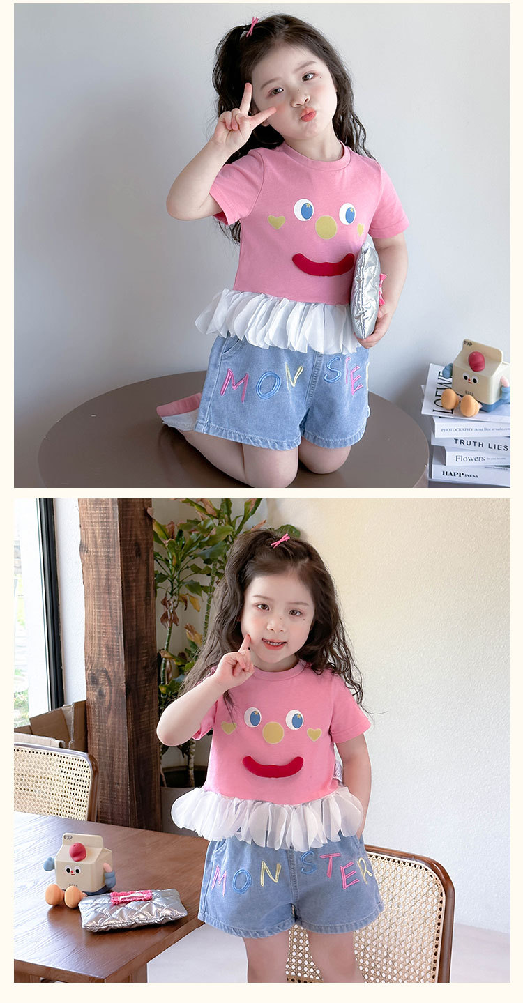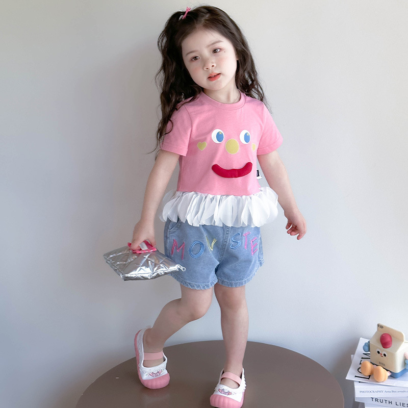 아기 티셔츠 세트 소녀 외국 스타일 패션 2025 웃는 얼굴 청바지 세트 여자 반바지 투피스 세트.스토어 가기