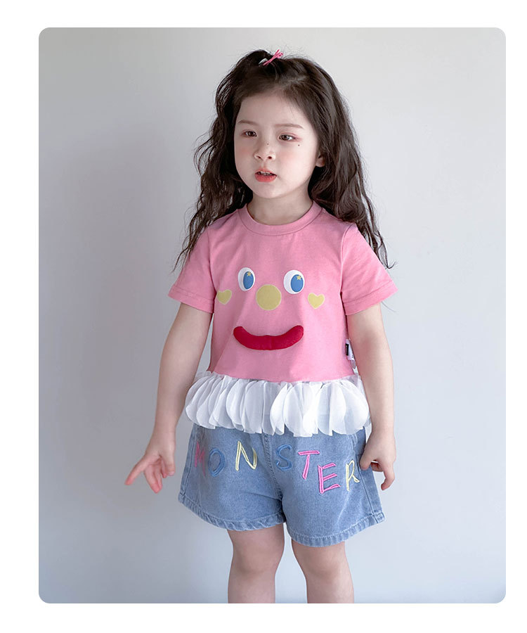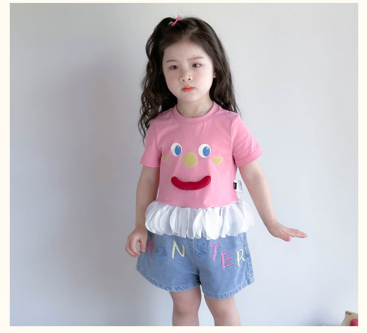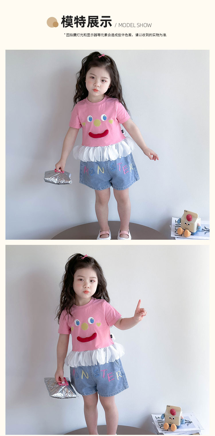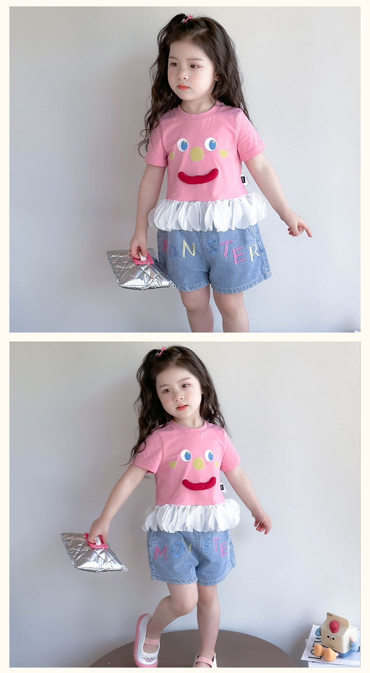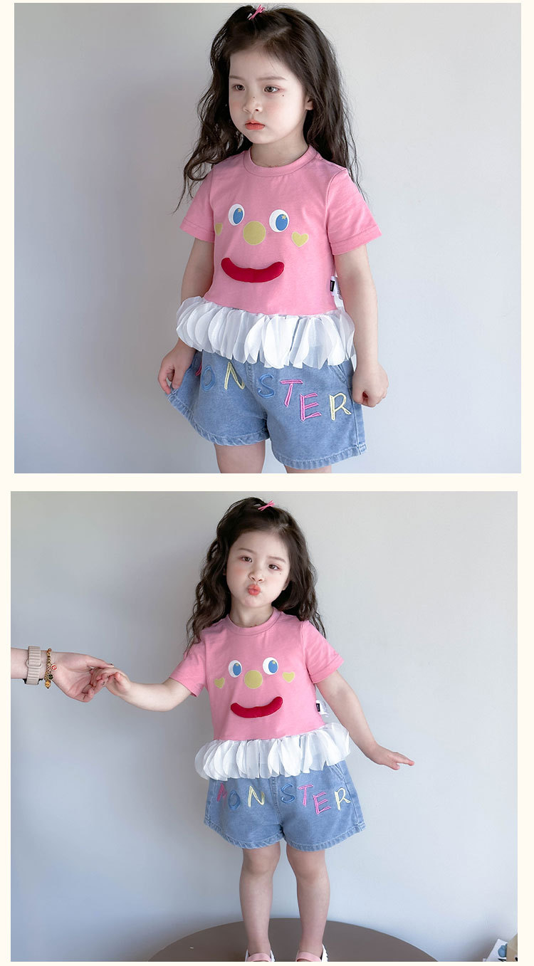 아기 티셔츠 세트 소녀 외국 스타일 패션 2025 웃는 얼굴 청바지 세트 여자 반바지 투피스 세트.스토어 가기