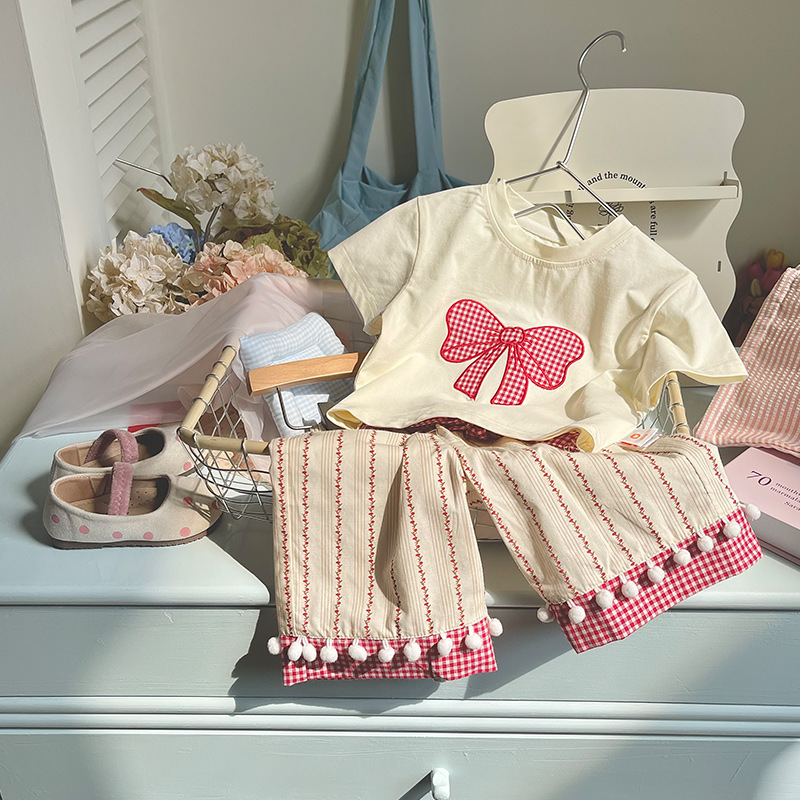 재고 DZ25216 소녀 세트 2025 여름 자수 활 티셔츠 웨스턴 디자인 센스 스트라이프 바지 세트